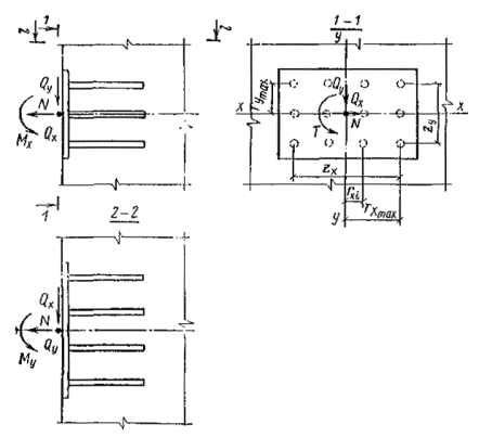 к осям анкеров; при эксцентриситете силы относительно центра тяжести анкеров