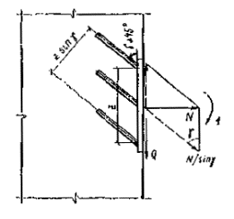 Рис. 6. Схема усилий, действующих на закладную деталь при наличии крутящего момента Рис. 7. Схема усилий, действующих на закладную деталь с анкерами, приваренными внахлестку и втавр rx max и rу тах - расстояния от анкерного стержня, наиболее удаленного от центра тяжести всех анкеров, соответственно до осей у и х; rx i и rу i - расстояния анкерного стержня соответственно до осей y и х. 4.4. В закладной детали с анкерами, приваренными внахлестку под углом от 15 до 30° и втавр (рис. 7), наклонные анкеры следует рассчитывать на действие сдвигающей силы (при Q>N, где N - отрывающая сила) по формуле где При этом устанавливаются нормальные анкеры, которые следует рассчитывать по формуле (1) при j1 = 1 и при значении Qan, равном 0,1 сдвигающего усилия, определяемого по формуле (3). Допускается уменьшать площадь сечения наклонных анкеров за счет передачи на нормальные анкеры части сдвигающей силы, равной Q - 0,9 RsAan,tot,i. В этом случае j1 определяется по формуле (6). Если на закладную деталь действует только сдвигающая сила, площадь сечения нормальных и наклонных анкеров рекомендуется определять из условия Q £ 0,9 Rs Аап,tot,i + 0,9 Rs Аап,tot j. (21) где j - см. п. 4.1 настоящих Рекомендаций; при этом второе слагаемое должно быть не менее 0,1Q. 4.5. Если под флюсом к пластине приварены только наклонные анкеры под углом g³45° (рис. 8), при Qan > Nan/tg g расчет таких анкеров можно производить аналогично расчету нормальных анкеров (см. п. 4.1 настоящих Рекомендаций) по формуле где Aan,I - площадь сечения анкеров наиболее напряженного ряда;