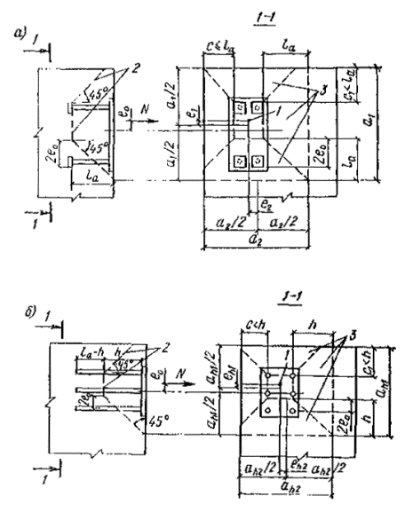 Сжимающие напряжения в бетоне sbc, перпендикулярные нормальному анкеру и распределенные по всей его длине, определяются как для упругого материала по приведенному сечению от постоянно действующих нагрузок при коэффициенте надежности по нагрузке, равном 1; а1 и а2 - размеры проекции поверхности выкалывания; e1 и e2 - эксцентриситеты силы N относительно центра тяжести площади А в направлении соответственно а1 и а2; б) для анкеров без усиления на концах расчет производят из условия где Аh - то же, что и А,