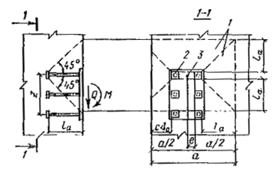 бетона растянутыми анкерами закладной детали при 1 - проекция поверхности выкалывания на плоскость, нормальную к анкерам; 2 - анкерная пластина; 3 - точка приложения усилия Nan Рис. 11. Конструкция закладной детали, при которой не требуется расчет на выкалывание а - закладная деталь с коротышами, симметрично зацепленными за продольную арматуру колонны; б - эпюра Q участка колонны с закладной деталью; в - анкеры закладной детали с анкерными пластинами, несимметрично зацепленными за продольную арматуру колонны; 1 - поперечные коротыши, приваренные контактной сваркой к анкерам; 2 - анкеры; 3 - анкерные пластинки lа