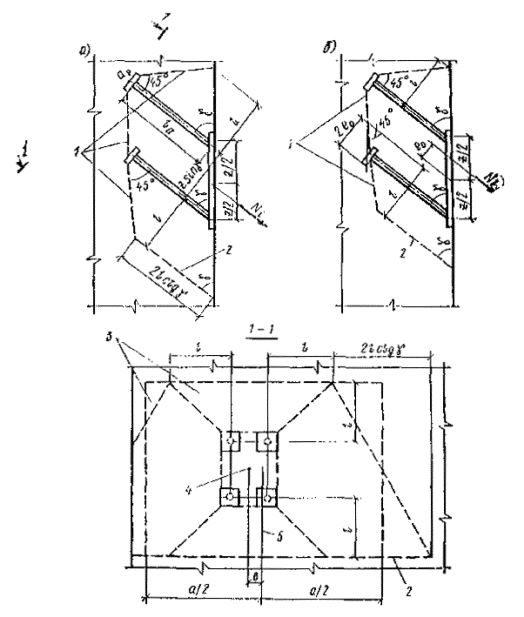 бетона наклонными анкерами при 1 - поверхность выкалывания; 2 - поверхность среза; 3 - проекция поверхности выкалывания на плоскость, нормальную к анкерам; 4 - точка приложения силы Nan,i; 5 - линия центра тяжести площади Ai1 Если число рядов анкеров в