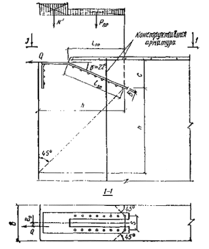 действующих нагрузок при коэффициенте надежности по нагрузке, равном 1; При наличии в бетоне на участке полосового анкера растягивающих напряжений, перпендикулярных направлению силы Q, условием (52) пользоваться нельзя. 4.18. Расчет на смятие тяжелого бетона (классов В12,5-В30) под сферическими выступами растянутых полосовых анкеров штампованных закладных деталей (см. пп. 5.11-5.13) производится из условия Q £ 1,33 где Q - в Н; Rb - в МПа; Asp - площадь проекции поверхности одного сферического выступа на плоскость, нормальную к оси полосового анкера, мм2; nsp - число сферических выступов на одном полосовом анкере; nsp£9; nsa - число растянутых полосовых анкеров в штампованной полосовой детали. Рис. 18. Схема откалывания бетона полосовыми анкерами штампованной закладной детали 4.19. Расчет на откалывание тяжелого бетона классов В12,5-В30 растянутыми полосовыми анкерами, расположенными в одном ряду штампованной закладной детали при 15°£g£25° (рис. 18), выполняют из условия где h - расстояние от центра
