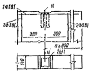 Пример 6. Дано: к закладной детали колонны приварен элемент стальных связей, в котором возникает усилие от ветровой нагрузки, равное N = 290 кН (рис. 31); пластина закладной детали выполнена из стали марки ВСт3кп2 (Rу = 205 МПа), а анкеры закладной детали - из арматуры класса A-III (Rs =365 МПа); бетон колонны принят тяжелый класса B40 (Rb = 22,5 МПа; Rbt = 1,4 МПа); схема армирования колонны приведена на рис. 31; минимальная продольная сила, действующая в колонне, 1400 кН; изгибающий момент в колонне на уровне закладной детали в плоскости ее анкеров М = 50 кН×м. Требуется запроектировать анкеры закладной детали, определить толщину пластины и проверить прочность бетона на выкалывание. Рис. 31. К примеру 6 Расчет. Поскольку центр тяжести анкеров совпадает с точкой приложения отрывающей силы N = 290 кН, то М = 0. Принимая Q = 0, по формуле (1) определяем суммарную площадь сечения анкеров: