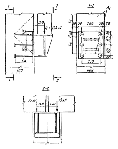 равно: Определяем площадь сечения нормальных анкеров согласно пп. 4.1 и 4.4 настоящих Рекомендаций и располагаем их в два ряда по высоте (nan = 2). Поскольку отрывающая сила N приложена без эксцентриситета, M = 0, тогда