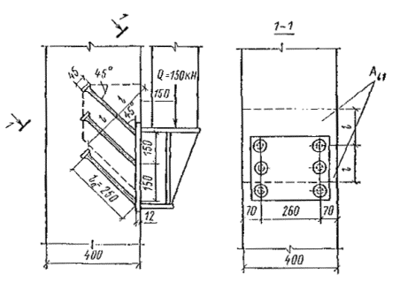 т.е. прочность бетона на выкалывание обеспечена. Пример 9. По данным примера 8 запроектировать анкеры закладной детали при действии силы, равной 570 кН (рис. 33, a). Расчет. Находим силы сдвигающую Q и нормальную N: Q = 570 cos 30° = 570×0,866 = 494 кН; N = 570 sin 30° = 570×0,5 = 285 кН. По формуле (20) определяем общую площадь сечения наклонных анкеров Aan, приваренных внахлестку.