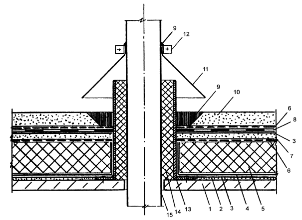 Примечание: Запрещается стяжку из литого асфальтобетона предусматривать по теплоизоляции из пенопласта или с применением гранул пенопласта. 5-4-3. Температурно-усадочные швы в стяжках шириной до 5 мм должны быть перекрыты полосами шириной 150 мм из рулонного водоизоляционного материала с точечной приклейкой их с одной стороны шва. 5-4-4. В местах примыкания к стенам, парапетам и другим конструктивным элементам, проходящим через кровлю, должны быть выполнены наклонные бортики (галтели) под углом 45 ° из цементно-песчаного раствора или асфальтобетона; высота их должна быть около 100 мм. Вертикальные поверхности конструкций, выступающих над кровлей и выполненных из кирпича или блоков, должны быть оштукатурены цементно-песчаным раствором на высоту подъема дополнительного водоизоляционного ковра, но не менее 350 мм. 5-5. Водоизоляционный ковер (схема 1 позиция 8): 5-5-1. В эксплуатируемых кровлях и инверсионный и традиционный варианты эксплуатируемых кровель предъявляют высокие требования к водоизоляционному ковру, т.к. при протечках возникают значительные трудности в определении мест его повреждения и выполнении ремонтных работ из-за необходимости, в большинстве случаев, снятия верхних защитных слоев кровли и даже теплоизоляционного слоя (в инверсионной кровле). В связи с этим, ковер следует предусматривать из трех слоев наплавляемых рулонных материалов с гибкостью при отрицательных температурах не ниже минус 15 °С, например изопласт, днепрофлекс и др. либо из двух слоев рулонных материалов с аналогичным показателем гибкости, один из которых толщиной не менее 4 мм с двумя армирующими основами, например «Дербигум» (см. таблица 5.2), и другой слой с одной армирующей основой. 5-5-2. Для повышения эксплуатационной надежности кровельного ковра, укладываемого на увлажненное основание под кровлю (выравнивающую стяжку), необходимо предусматривать укладку нижнего слоя водоизоляционного ковра с точечным креплением полотнищ рулонного материала дюбелями с шайбами в местах нахлестки смежных полотнищ материала с последующей приклейкой этих мест (рис. 1). В этих случаях в местах примыкания кровли к выступающим конструкциям (парапетам, стенам и др.) необходимо предусматривать выход воздуха наружу за счет наклейки нижнего полотнища дополнительного водоизоляционного ковра только в местах сопряжения с основным водоизоляционным ковром (рис. 2). 5-5-3. Не допускается применение холодных (на растворителях) мастик в кровлях, выполненных с применением пенопластовых, пенополистирольных, минераловатных плит и композиционной теплоизоляции с применением пенополистирола. Рис. 1 Последовательность (а, б, в, г) раскладки рулонных материалов при устройстве водоизоляционного ковра с механическим закреплением 1 - переходный наклонный бортик; 2 - линия водораздела; 3 - основание под кровлю; 4 - нижний слой водоизоляционного ковра; 5 - шайбы с дюбелями; 6 - наклейка полотнищ в местах нахлесток; 7 - верхний (второй) слой водоизоляционного ковра Рис. 2 Примыкание кровли к парапету (стене) при механическом закреплении нижнего слоя водоизоляционного ковра 1 - сборная железобетонная плита покрытия; 2 - пароизоляция (по расчету); 3 - теплоизоляция; 4 - выравнивающая стяжка; 5 - механически закрепляемый нижний слой основного водоизоляционного ковра; 6 - верхний слой основного водоизоляци