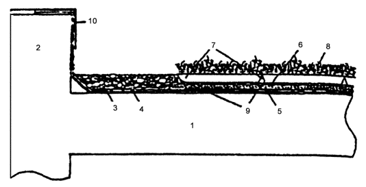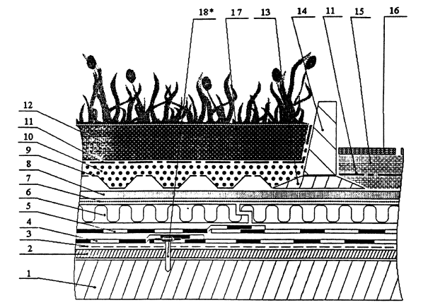 1 - разделительный пласт; 2 - противокорневой слой; 3 - защитный слой; 4 - зажимной профиль; 5 - обочина; 6 - разделительный холст; 7 - растительный субстрат; 8 - поверхность крыши; 10 - несущая поверхность; 11 - боковая стенка. 4. Заявка Германии № 4120777, МКИ E04D11/00, 1992 г. «Плоская крыша». В заявке описывается улучшенная плоская крыша, включающая в себя располагаемые друг над другом в следующей последовательности: покрытие кровли 1, защитные маты 2 и кровельный гидроизоляционный материал 3. В другом варианте по покрытию кровли размещается кровельный гидроизоляционный материал и грязевые маты. Грязевые маты состоят из формованного текстильного материала, имеющего прочность на сжатие более 0,01 Н/мм2, объемный вес по меньшей мере 7 кг/м3 и толщину от 3 до 33 мм. В патентных материалах имеются разработки, относящиеся к кровлям, состоящим из двух и более соединенных слоев, один из которых является водонепроницаемым. Конструкция крыши разработана таким образом, что предусматривает возможность нанесения субстрата 8 и выполнения озеленяемой крыши.