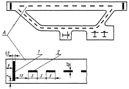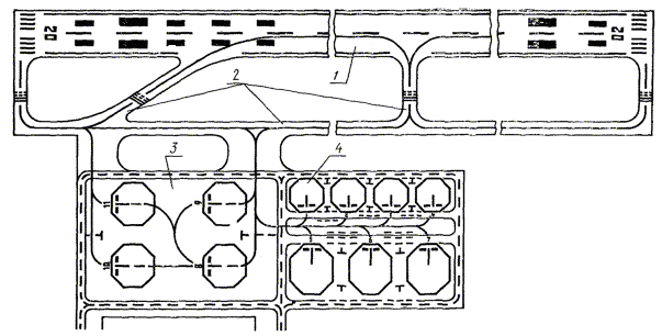Черт. 10 (Новая редакция, Изм. № 1). Пути движения специальных машин 1 - пути движения специальных машин; 2 - знак Т для остановки специальных машин; 3 - пунктирные линии, разрешающие въезд или выезд специальных машин; 4 - место вынужденного въезда или выезда; 5 - знак остановки самолета; 6 - контур зоны обслуживания Черт. 11 При маркировке зоны обслуживания групповых стоянок самолетов групп III и IV, маркировочную линию восьмиугольника располагают на расстоянии 1,5 м от крайней габаритной точки самолета. 4.6. Пути движения специальных машин для аэродромов всех классов маркируют сплошными и пунктирными линиями с шагом 1 м шириной 0,10 м, белого цвета согласно черт. 11. Все пути движения специальных машин не должны совмещаться с осями руления самолетов. (Измененная редакция, Изм. № 1). 4.7. Односторонние пути движения специальных машин должны проходить перед стоящими самолетами на расстоянии 2 м от носовой части и от консоли крыла самолета, ширина одностороннего пути движения должна быть 3,5 м. 4.8. Двухсторонние пути движения специальных машин проходят за стоящими самолетами и имеют ширину 7 м. 4.9. Пути движения маркируют двумя сплошными линиями, обозначающими ширину проезжей части, двухсторонние пути движения дополнительно маркируют разделительной пунктирной линией. Между стоянками самолетов предусматриваются специальные проезды, где сплошная линия прерывается и заменяется пунктирной (черт. 11). 4.10. В промежутках между стоянками самолетов наносят знак Т белого цвета, указывающий место остановки специальных машин. Маркировочный знак Т располагают на расстоянии не менее 10 м от крайних габаритных точек стоящих самолетов. Форма и размер знака приведены на черт. 11. СОДЕРЖАНИЕ