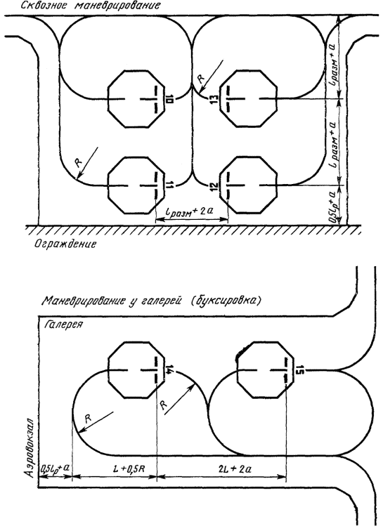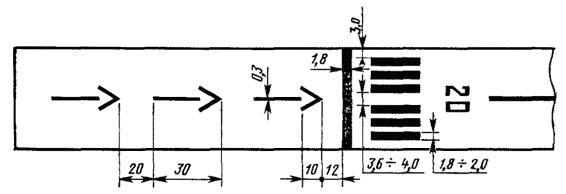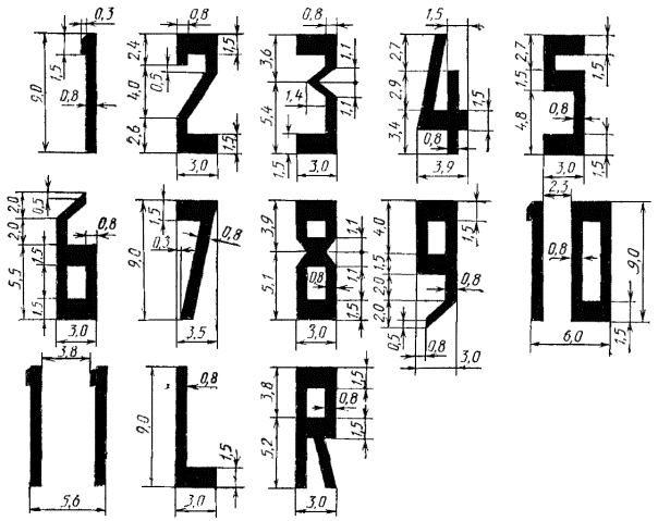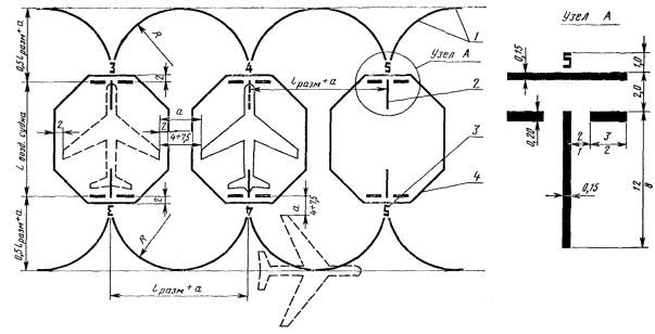 (Новая редакция, Изм. № 1). 3.4. Ненесущие поверхности обочин РД, площадок ожидания и перронов, трудно отличимые от несущих поверхностей, отделяют рулежными боковыми маркировочными полосами. Рулежная боковая маркировочная полоса состоит из двух сплошных линий шириной по 0,15 м с интервалом между ними 0,15 м и наносится по кромке несущего покрытия так, чтобы внешний край полосы совпадал с кромкой несущего покрытия и имел тот же цвет, что и осевая линия РД - черт. 7. Маркировка РД 1 - место ожидания самолетов; 2 - ось РД; 3 - участок сопряжения РД с ИВПП; 4 - край ИВПП; 5 - рулежная боковая маркировочная полоса Черт. 7 (Новая редакция, Изм. № 1). 4. МАРКИРОВКА МЕСТ СТОЯНКИ (МС) и ПЕРРОНА4.1. Маркировку МС и перрона производят с учетом размещения типов самолетов и особенностей технологии их обслуживания. На местах стоянок и перроне наносят: оси руления самолетов по прямой, кривой (линии заруливания, разворота и выруливания); Т-образные знаки остановки самолетов и специальных машин; номера стоянок самолетов, контуры зон обслуживания и пути движения специальных машин согласно черт. 8-11. Маркировка МС Примечание: Числитель - размеры для аэродромов классов А, Б и В; знаменатель - для Г и Д. 1 - оси руления по прямой и кривой; 2 - Т-образный знак, место остановки самолета; 3 - цифра (номер стоянки); 4 - зона обслуживания Черт. 8 (Новая редакция, Изм. № 1). Форма и размер цифр на МС и перроне Черт. 9 4.2. Заход самолета на стоянку при помощи тягача, а также выход самолета со стоянки на тяге собственных двигателей или при помощи тягача осуществляется по кривой соответствующей эксплуатационному радиусу поворота. Заход самолета на стоянку на тяге своих двигателей производится по кривой соответствующей минимальному радиусу поворота самолета. Линии захода самолета на тупиковую стоянку маркируют по кривой, соответствующей эксплуатационному радиусу. (Новая редакция, Изм. № 1). 4.3. Т-образный знак обозначает место остановки крайней габаритной точки самолета. Форма и размеры знака приведены на черт. 8. Расстояние между Т-образными знаками должно равняться размаху крыла расчетного типа самолета, плюс безопасное расстояние между стоящими самолетами (а = 4 - 7,5 м.). (Новая редакция, Изм. № 1). Расстояние между осями руления по прямой и поперечными линиями Т-образного знака должно равняться половине размаха крыла расчетного типа самолета, плюс безопасное расстояние oт стоящего самолета до двигающегося самолета или препятствия (а = 4 - 7,5м). 4.4. Цифры, обозначающие порядковый номер места стоянки для всех классов аэродромов, наносят на расстоянии 2 м впереди Т-образного знака. Форма цифр и размеры приведены на черт. 9. 4.5. Контур зоны обслуживания наносят сплошной линией красного цвета шириной 0,15 м в виде восьмиугольника. Размеры восьмиугольника должны соответствовать габаритным размерам эксплуатируемых самолетов. Все стороны восьмиугольника должны находиться на расстоянии 2 м от крайних габаритных точек самолетов. Маркировка перрона