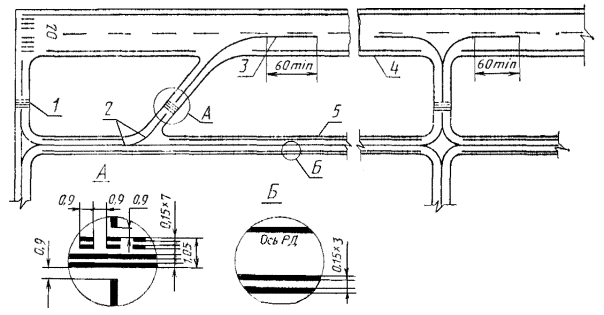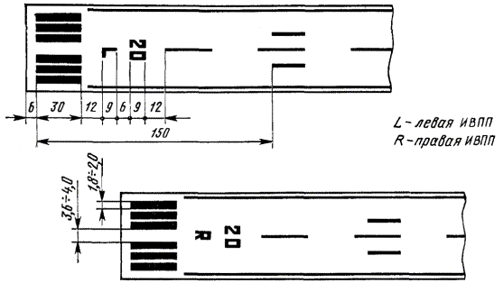 2.5. Зону приземления маркируют парами прямоугольных симметричных полос, расположенных параллельно оси ИВПП, которые наносят с продольными интервалами 150 м от начала маркировки порога ИВПП. (Измененная редакция, Изм. № 1). 2.6. Фиксированное расстояние на аэродромах классов А, Б и В обозначается парой параллельных прямоугольных полос, расположенных симметрично оси ИВПП на расстоянии 300 м от начала маркировки порога ИВПП. (Измененная редакция, Изм. № 1). 2.7. Края ИВПП маркируют в международных аэропортах, а также на оборудованных по I, II и III категориям ИКАО ИВПП и выполняют в виде двух сплошных линий шириной по 0,9 м, каждую из которых располагают вдоль боковой границы ИВПП на расстоянии 3 м от знаков маркировки порога и 1 м от кромки покрытия. Форма и размеры цифр и букв на ИВПП Черт. 4 2.8. Параллельные ИВПП дополнительно со стороны захода на посадку маркируют латинскими буквами L (левая) и R (правая), которые располагают между знаками порога и цифровыми знаками (ПМПУ) согласно черт. 5. Форма букв и их размеры приведены в черт. 4. 2.10. В местах пересечения ИВПП с РД маркировку края ИВПП прерывают, а маркировку РД сохраняют. Маркировка параллельных ИВПП Черт. 5 2.11. Неклассифицированные аэродромы маркируют согласно черт. 6. (Новая редакция, Изм. № 1). Схема маркировки неклассифицированных аэродромов 1 - порог; 2 - ось ИВПП Черт. 6 (Новая редакция, Изм. № 1). 3. МАРКИРОВКА РУЛЕЖНЫХ ДОРОЖЕК (РД)3.1. Покрытия РД маркируют по продольной оси РД, на участках сопряжения РД с ИВПП и в местах ожидания самолетов перед выруливанием на ИВПП согласно черт. 7. 3.2. Продольную ось РД (траекторию движения носового колеса) на прямолинейных и криволинейных участках маркируют сплошной линией шириной 0,15 м по всей длине, за исключением тех случаев, когда она пересекается с маркировкой места ожидания при выруливании на ИВПП. Маркировку осевой линии РД в местах сопряжения с ИВПП продолжают параллельно маркировке осевой линии ИВПП на расстоянии не менее 60 м от точки касания. 3.3. Маркировочный знак места ожидания самолета перед выруливанием на ИВПП наносят на расстоянии от оси ИВПП согласно табл. 3 и маркируют в соответствии с черт. 7. Таблица 3