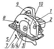 1 - неподвижный защитный кожух; 2 - отверстие для выброса опилок; 3 - указание направления вращения пильного диска; 4 - подвижный защитный кожух; 5 - направляющая плита; 6 - расклинивающий нож; 7 - направление открытия подвижного защитного кожуха; 8 - устройство крепления расклинивающего ножа; 9 - выключатель; 10 - пильный диск