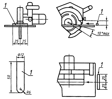 Над направляющей плитой доступ к периферии диска ножа с тыльной и боковой сторон должен надежно предотвращаться неподвижным защитным кожухом. Если это требуется условиями эксплуатации, то доступ к периферии диска ножа с передней стороны машины должен быть ограничен таким образом, чтобы исключалась возможность касания с периферией диска ножа испытательного щупа диаметром 13 мм и длиной 50 мм.