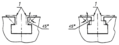 junctions Дата введения 1996-07-01 Настоящий стандарт распространяется на детали и сборочные единицы сборно-разборных приспособлений (СРПС) с пазами 8, 12, 16, 28 и 42 мм. 1 ТЕХНИЧЕСКИЕ ТРЕБОВАНИЯ1.1 Детали и сборочные единицы СРПС должны быть изготовлены по рабочим чертежам, утвержденным в установленном порядке, и соответствовать климатическому исполнению О по ГОСТ 15150. 1.2 Конструкция деталей и сборочных единиц СРПС должна обеспечивать точность собираемых в приспособлениях металлоконструкций по 11-му квалитету ГОСТ 25347. Срок службы базовых и корпусных деталей - не менее 10 лет; сборочных единиц - не менее 5 лет; установочных, направляющих и крепежных деталей - не менее 2 лет. 1.3 Требования к материалам Детали СРПС должны быть изготовлены из материалов, обеспечивающих выполнение п. 1.2. Материалы для изготовления деталей и сборочных единиц СРПС приведены в приложении А. 1.4 Требования к заготовкам 1.4.1 Поковки из углеродистых и легированных сталей должны соответствовать II группе поковок по ГОСТ 8479. 1.4.2 Допуски на размеры и технологические напуски для поковок из углеродистых и легированных сталей - по ГОСТ 7062. 1.4.3 Чугунные отливки должны соответствовать II группе ГОСТ 977, стальные - ГОСТ 26358. 1.4.4 Допуски размеров и массы отливок, а также припуски на механическую обработку - по ГОСТ 26645. 1.4.5 Неуказанные литейные радиусы - по ГОСТ 10948, формовочные уклоны - по ГОСТ 3212. 1.4.6 Типы и конструктивные элементы сварных швов - по ГОСТ 8713, ГОСТ 14771, ГОСТ 5264. 1.4.9 На необработанных поверхностях отливок и поковок не допускаются более трех раковин или забоин размером более 5 мм и глубиной более 3 мм на площади 50 см3, шлаковые включения и групповые раковины общим диаметром более 3 мм на площади 100 см2. 1.5 Требования к механически обработанным деталям 1.5.1 На поверхности деталей с параметром шероховатости Ra £ 25 мкм по ГОСТ 2789 не допускается более трех раковин глубиной более 1 мм и диаметром более 5 мм на площади 50 см2. 1.5.3 На рабочих поверхностях закаленных деталей допускаются следы контроля твердости - не более трех на одной поверхности. 1.5.4 Дефекты, превышающие нормы, указанные в 1.4.10, 1.5.1, 1.5.2, допускается исправлять сваркой, если это не снижает качества и не ухудшает товарного вида деталей. В местах изделий, заключенных внутри контура 1 (рисунок 1), исправление дефектов сваркой не допускается. 1.5.5 Размеры канавок для выхода шлифовального круга, фасок и радиусов закругления Т-образных и П-образных пазов, а также глубина понижения дна Т-образных пазов должны соответствовать указанным на рисунке 2 и в таблице 1. Допускается притупление наружных кромок Т-образных и П-образных пазов деталей с пазами 8 и 12 мм фаской 0,4´45°, деталей с пазами 16, 28 и 42 мм - 1,0´45°. Рисунок 1 Рисунок 2 1.5.6 На внутренних углах Т-образных пазов, а также на вершинах канавок П-образных пазов допускаются радиусы или фаски, размер которых обеспечивается режущим инструментом. Таблица 1 В миллиметрах