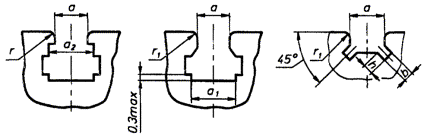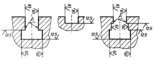 1.5.11 Параметр шероховатости резьбы не должен быть более: основной метрической - Ra 3,2 мкм; вспомогательной - Ra 6,3 мкм; трапецеидальной - Ra 2,5 мкм. 1.5.12 Размеры сбегов, недорезов (уменьшенных), проточек (узких) и фасок для резьб - по ГОСТ 10549. 1.5.13 Требования к болтам, винтам, шпилькам и гайкам - по ГОСТ 1759.0. 1.5.14 Механические свойства болтов, винтов и шпилек проверяют по ГОСТ 1759.4. 1.6 Требования к термической обработке - с пазами 8 мм - от 0,7 до 1,0 мм; - с пазами 12, 16, 28 и 42 мм - от 0,9 до 1,6 мм. 1.6.2 Содержание углерода в поверхностном слое цементированных деталей должно быть 0,8-1,1 %. 1.6.3 Допускается полости Т-образного паза (кроме поверхностей А, рисунок 4) и выборки, а также поверхности технологических канавок П-образных пазов не цементировать, при этом твердость указанных поверхностей должна быть такой же, как и твердость сердцевины детали. Резьбу от цементации следует предохранять. 1.6.4 После термической обработки детали должны быть очищены от окалины. 1.7 Требования к покрытию 1.7.1 Детали СРПС должны быть защищены термостойким покрытием - смазкой ВНИИ НП-230. 1.7.2 Перед нанесением смазки детали должны быть подвергнуты фосфатированию. Толщина фосфатного покрытия 7-10 мкм. Требования к фосфатному покрытию - по ГОСТ 9.301. Допускается оксидирование поверхности вместо фосфатирования. 18. Требования к шероховатости поверхностей 1.8.1 Параметр шероховатости Ra по ГОСТ 2789 не должен превышать: - установочных поверхностей плоскостей крупных чугунных плит - 6,3 мкм; стальных плит - 3,2 мкм; - установочных отверстий диаметром до 12 мм - 3,2 мкм; диаметром свыше 12 мм - 1,6 мкм; - установочных плоских поверхностей опор и других деталей - 3,2 мкм; - поверхностей, обеспечивающих товарный вид, - 25 мкм. 1.8.2 Шероховатость Т-образных и П-образных пазов должна соответствовать указанной на рисунке 4. Рисунок 4 1.9 Требования к сборке 1.9.1 При сборке деталей не должно быть нарушений шероховатости обработанных поверхностей. 1.9.2 При сборке не допускаются подгонка деталей, применение не предусмотренных чертежами прокладок и прочих методов наращивания размеров деталей. Требования техники безопасности при эксплуатации деталей СРПС должны соответствовать ГОСТ 12.2.029. 2 ПРАВИЛА ПРИЕМКИ2.1 Для проверки соответствия выпускаемых деталей СРПС требованиям настоящего стандарта предприятие-изготовитель должно проводить приемо-сдаточные испытания. 2.2 Заготовки, детали и сборочные единицы предъявляют на проверку партиями. Партией считают заготовки, детали и сборочные единицы одного наименования, изготовленные из материала одной марки и термически обработанные по одному режиму. 2.3 При приемо-сдаточных испытаниях деталей и сборочных единиц проводят проверку их на соответствие требованиям 1.4.6-1.4.10, 1.5.1-1.5.14, 1.6.1-1.6.3, 1.7.1-1.7.3, 1.8.1, 1.8.2, 1.9.3. 2.4 Проверке на соответствие требованиям 1.4.6, 1.4.9, 1.5.1-1.5.14, 1.6.1-1.6.3, 1.7.1-1.7.3, 1.8.1, 1.8.2, 1.9.3 подвергают каждую деталь и сборочную единицу. 2.5 Испытанию на разрыв (п. 1.5.14) следует подвергать не менее трех пазовых болтов, шпилек от партии по ГОСТ 1759.4. Наименьшие значения разрывных усилий должны соответствовать указанным в таблице 3. Таблица 3