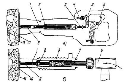 1.8. Область применения, технические данные, требования безопасности и приемы работы с пороховыми инструментами должны быть изложены в «Техническом описании и инструкции по эксплуатации». 1.9. Разработка инструментов и организация их серийного производства должны производиться в соответствии с ГОСТ 15.001-73. Базовой организацией по стандартизации пороховых инструментов является Всесоюзный государственный научно-исследовательский и проектный институт ВНИИпроектэлектромонтаж Главэлектромонтажа Минмонтажспецстроя СССР. 2. ПОРОХОВЫЕ ИНСТРУМЕНТЫ. ТИПЫ, ТЕХНИЧЕСКИЕ ДАННЫЕ, ОБЛАСТЬ ПРИМЕНЕНИЯ, ХРАНЕНИЕ И РЕМОНТ2.1. ПОРОХОВЫЕ ИНСТРУМЕНТЫ ДЛЯ ЗАБИВКИ ДЮБЕЛЕЙ2.1.1. К пороховым инструментам для забивки дюбелей относятся работающие по поршневой схеме монтажный пистолет ПЦ52-1 (рис. 1, а), выпускаемый по ТУ 3-741-74, и оправка ОДП-6 (рис. 1, б), выпускаемая по ТУ 36-992-75. Рис. 1. Забивка дюбеля: 1 - поршень; 2 - амортизаторы; 3 - патрон; 4 - боевая пружина; 5 - курок; 6 - спусковой рычаг; 7 - зарядный шток; 8 - молоток; 9 - дюбель; 10 - закрепляемое изделие; 11 - строительное основание 2.1.2. Применяя пороховые инструменты для забивки дюбелей, можно крепить электротехническое, сантехническое и вентиляционное оборудование, гидро-, звуко- и теплоизоляционные материалы и конструкции, отделочные, кровельные, стеновые и другие материалы и изделия к различным строительным основаниям. 2.1.3. Пороховыми инструментами можно забивать дюбеля в поверхности несущих и ограждающих деталей и конструкций зданий и сооружений, выполненных из следующих материалов: тяжелого (с заполнителем естественных каменных пород до марки М1200) бетона и железобетона до марки М400 включительно; легкого (с искусственным заполнителем) бетона и железобетона от марки М100 и выше; Таблица 1
