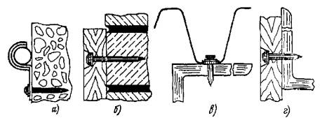кирпичной (оштукатуренной и неоштукатуренной) кладки, выполненной из сплошного глиняного (красного) или силикатного (белого) кирпича до марки М150 включительно; сортового (прокатанного или гнутого) стального профиля из стали с пределом прочности до 450 МПа (45 кгс/мм2). 2.1.4. Основные технические данные пороховых инструментов для забивки дюбелей приведены в табл. 1. Рис. 2. Неразъемные крепления дюбелями-гвоздями: а - трубопровода к бетонному основанию; б - деревянной детали к кирпичу; в - профильного стального настила к стальному основанию из сортового проката; г - деревянной детали к стальному основанию из сортового проката 2.1.5. В пороховых инструментах для поршневой забивки дюбелей предусмотрено применение дюбелей-гвоздей и дюбелей-винтов различных длин со стержнями различных диаметров. 2.1.6. Неразъемное крепление конструкций осуществляется при помощи дюбелей-гвоздей, которые, обладая высокими твердостью и прочностью, пробивают закрепляемое изделие или вспомогательную деталь без предварительного выполнения в них отверстия, внедряются в строительное основание и закрепляются в нем (рис. 2). Таблица 2