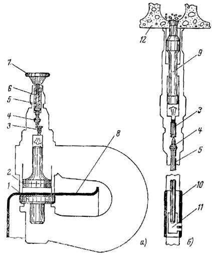 2.1.12. Если количество незакрепленных дюбелей превышает 20 % общего количества забитых дюбелей (предельно допустимое количество отказов), поршневая забивка дюбелей нецелесообразна. 2.1.13. При увеличении количества незакреплений дюбелей следует проверить качество дюбелей на соответствие техническим условиям. 2.1.14. Перед пристрелкой стальных деталей или при забивке дюбелей в стальное основание необходимо убедиться, что прочность и твердость дюбеля выше, чем материала, в который он должен быть забит. 2.1.15. Проверку следует проводить кернением - ударом молотка по шляпке дюбеля, установленного острием к пристреливаемой стальной детали или основанию. Если острие дюбеля тупится, его поршневая забивка в это основание или деталь запрещается. 2.1.16. При соблюдении условий крепления согласно табл. 3 допускаемая нагрузка в осевом направлении на дюбель, забитый: в стену и пол из тяжелого бетона и железобетона, - не более 500 Н (50 кгс); в потолок из тяжелого бетона и железобетона, - не более 150 Н (15 кгс); в стену из сплошного красного и белого кирпича, - не более 200 Н (20 кгс); в строительное основание из легкого бетона, - не более 150 Н (15 кгс); в строительное основание из сортовой стали, - не более 1500 Н (150 кгс) для дюбелей ДГС; не более 800 Н (80 кгс) для дюбелей ДГПШ. 2.1.17. Наименьшее расстояние от точки забивания дюбеля до ближайшего края строительного основания должно быть: 100 мм для бетонного, железобетонного и кирпичного оснований; 20 мм для стального основания. 2.1.18. При креплении на неоштукатуренной поверхности кирпичной клади дюбель необходимо забивать в центр кирпича. 2.1.19. Наименьшее расстояние между соседними дюбелями, забиваемыми в строительное основание, должно быть 50 мм для бетонного и железобетонного оснований; 20 мм для стального основания. 2.1.20. Наименьшая ширина элемента пристреливаемого изделия должна быть 20 мм для стальных полосовых деталей (лапка аппарата, шина заземления); 40 мм для деревянных деталей (рейка, брус). 2.1.21. Наименьшая толщина строительного основания в месте забивания дюбеля должна быть 80 мм для бетонного и железобетонного оснований, но не менее длины дюбеля плюс 30 мм; 6 мм для основания из сортовой стали. 2.1.22. Запрещается крепить на дюбелях для поршневой забивки оборудование, которое при эксплуатации подвержено динамическим и вибрационным нагрузкам. 2.2. ПОРОХОВЫЕ ИНСТРУМЕНТЫ ДЛЯ ПРОБИВКИ ОТВЕРСТИЙ2.2.1. К пороховым инструментам для пробивки отверстий относятся инструмент ИПО-6 (рис. 3, а), выпускаемый по ТУ 36-1987-76, для пробивки отверстий под трубы в стенках стальных протяжных ящиков и коробок электротехнического назначения и ударная колонка УК-6 (рис. 3, б), выпускаемая по ТУ 36-2154-78, для пробивки отверстий в многопустотных железобетонных панелях потолочных перекрытий при монтаже электропроводок. 2.2.2. Инструмент ИПО-6 можно также использовать для пробивки отверстий в тонколистовом металле на расстоянии от края листа до центра отверстия не более 130 мм. Рис. 3. Пробивка отверстий: 1 - матрица; 2 - пуансон; 3 - патрон; 4 - боек; 5 - ударник; 6 - боевая пружина; 7 - пуговка; 8 - монтажное изделие; 9 - пробойник; 10 - муфта; 11 - втулка; 12 - панель перекрытия 2.2.3. С помощью пороховых инструментов ИПО-6 и УК-6 отверстия пробиваются соответственно пуансоном и пробойником, разгоняемых давлением пороховых газов. 2.2.4. Основные технические данные пороховых инструментов для про