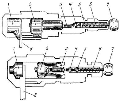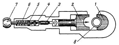 Рис. 5. Соединение труб прессом ППСТ-33М: 1 - матрица; 2 - пуансон; 3 - патрон; 4 - боек; 5 - ударник; 6 - боевая пружина; 7 - пуговка; 8 - стальная труба (муфта, раструб) 2.4.3. Основные технические данные пресса ППСТ-33М приведены ниже: Габаритные размеры, мм.............................................. 380´90´80 Масса порохового инструмента в рабочем положении, кг.................................................................................... 6 Масса комплекта порохового инструмента в инвентарном футляре (в состоянии поставки), кг.................................................................................... 10 Используемые патроны................................................ МПУ-1 и МПУ-2 Размеры соединяемых труб, мм: наружный диаметр электросварных труб по ГОСТ 10704-76 и ТУ 14-3-729-78.................................................................................... 20; 25; 32 условный проход (наружный диаметр) водогазопроводных труб по ГОСТ 3262-75.................................................................................... 15 (21,3); 20 (26,8); 25 (33,5) Гарантированное количество выстрелов.................... 10000 Запирание патрона в стволе......................................... Жесткое Способ воспламенения патрона.................................. Ручным оттягиванием ударника и наколом капсюля под действием разжимающейся боевой пружины Экстракция стреляной гильзы..................................... Ручная, шомполом с зацепами Отдача при выстреле..................................................... Воспринимается массой инструмента и руками рабочего Блокировка от случайного выстрела........................... При недоввинченном затворе; при падении с высоты до 1,5 м 2.4.4. Для получения качественного (за один выстрел) соединения труб патрон и соответствующие пуансон и матрица должны выбираться в соответствии с «Техническим описанием и инструкцией по эксплуатации» с учетом наружного диаметра и вида соединяемых труб. 2.5. ХРАНЕНИЕ, УЧЕТ, РЕМОНТ И ТРАНСПОРТИРОВАНИЕ ПОРОХОВЫХ ИНСТРУМЕНТОВ2.5.1. Порядок хранения, подготовки к работе и выдачи пороховых инструментов должен соответствовать требованиям «Положения об организации инструментального хозяйства в строительстве», утвержденного Госстроем СССР 4 мая 1971 г. 2.5.2. Все места и условия хранения пороховых инструментов должны исключать их хищение, использование не по назначению, порчу от попадания влаги и устанавливаться приказом по монтажной организации (управлению, участку). 2.5.3. До начала эксплуатации пороховые инструменты должны храниться в состоянии поставки в складских закрытых помещениях строительно-монтажных организаций с соблюдением климатических факторов воздействия внешней среды по группе С (ГОСТ 15150-69). 2.5.4. Хранить пороховые инструменты при ежедневной выдаче для работы необходимо в инструментально-раздаточных пунктах (ИРП). При этом в ИРП допустимо хранить до четырех пороховых инструментов совместно с патронами в месте, оборудованном в соответствии с требованиями, установленными для монтажных патронов (раздел 4 настоящей Инструкции). 2.5.5. Пороховые инструменты для производства работ нужно выдавать только на основании предварительно оформленного наряда-допуска (приложение 1). Выдачу пороховых инструментов для работы по наряду-допуску и их возврат по окончании работ следует регистрировать в «Ведомости выдачи и возврата пороховых инструментов (приложение 2). 2.5.6. Данные закрытых нарядов-допусков должны использовать соответствующие службы строительно-монтажной организации при инвентаризации патронов, а также служба главного механика для учета работы порохового инстр