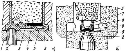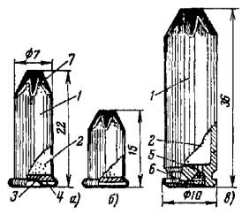 для ИПО-6 - обычной чертилкой по металлу; для колонки УК-6 - с пола специальным шаблоном-чертилкой с удлиненной ручкой. При настройке шаблона следует обеспечивать пробивку отверстий по центру пустотного канала бетонной панели. 2.3. ПОРОХОВЫЕ ИНСТРУМЕНТЫ ДЛЯ ОКОНЦЕВАНИЯ ЭЛЕКТРИЧЕСКИХ КАБЕЛЕЙ2.3.1. К пороховым инструментам для оконцевания электрических кабелей относятся прессы ППО-95М (рис. 4, а) и ППО-240 (рис. 4, б), выпускаемые по ТУ 36-1518-75 и 36-2128-78 соответственно. Применяются для выштамповки контактной лапки с отверстием под присоединительный болт на однопроволочных алюминиевых жилах электрических кабелей (ГОСТ 16442-70*, 18409-73* и 18410-73*), используемых в электроустановках напряжением до 10 кВ. Рис. 4. Оконцевание кабеля прессом: 1 - матрица; 2 - пуансон; 3 - патрон; 4 - боек; 5 - ударник; 6 - боевая пружина; 7 - пуговка; 8 - жила кабеля 2.3.2. Оконцевание жилы кабеля производится за один выстрел. Контактная лапка на жиле выштамповывается матрицей и пуансоном, разгоняемыми давлением пороховых газов. 2.3.3. Основные технические данные пороховых инструментов для оконцевания жил кабелей приведены в табл. 6. 2.3.4. Для получения качественного оконцевания сменный рабочий инструмент прессов необходимо выбирать с учетом сечений и размеров оконцовываемых жил, приведенных в табл. 7. Таблица 6