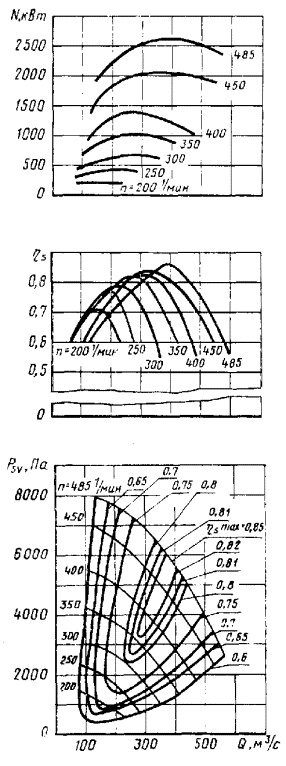 1. Аэродинамические качества вентилятора должны оцениваться по аэродинамическим характеристикам, построенным в виде графиков зависимости значений статического давления psv, мощности N и статического к.п.д. ηs от подачи Q при данном номинальном диаметре рабочего колеса, заданной частоте или частотах вращения и при работе с воздухом, имеющим плотность 1,2 кг/м3.