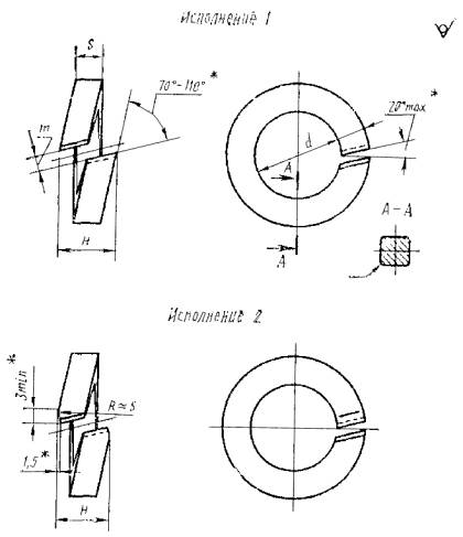 Пример условного обозначения пружинной шайбы исполнения 1 для болта диаметром 22 мм, из стали марки 65Г, без защитного покрытия: Шайба 22 ГОСТ 19115-91 То же, исполнения 2: Шайба 2.22 ГОСТ 19115-91 То же, из стали марки 60C2A: Шайба 22.60С2A ГОСТ 19115-91 Шайбы исполнения 2 изготавливаются по согласованию между изготовителем и потребителем. 2. ТЕХНИЧЕСКИЕ ТРЕБОВАНИЯ2.1. Основные технические требования - по ГОСТ 6402. 2.2. Пружинные шайбы должны изготовляться из проволоки по ГОСТ 11850, из стали марок 65 Г, 60С2А или других марок стали с механическими свойствами не ниже, чем у стали марки 65 Г по ГОСТ 14959. В случае применения стали марки 60С2А или других сталей, марка стали указывается в условном обозначении. 2.4. При контрольной проверке пружинящих свойств после сжатия шайб до плоского состояния в течение 24 ч уменьшение размера Н не должно превышать 0,8 мм. 2.5. Теоретическая масса шайб указана в приложении. 2.6. Временная противокоррозионная защита, упаковка шайб и маркировка тары - по ГОСТ 18160. 3. ПРИЕМКАПравила приемки - по ГОСТ 17769 для изделий класса точности С. Объем партии от 10001 до 35000 шт. 4. МЕТОДЫ КОНТРОЛЯМетоды контроля - по ГОСТ 6402, исключая проверку вязкости. 5. ТРАНСПОРТИРОВАНИЕТранспортирование шайб производится любым видом транспорта в соответствии с правилами перевозки, действующими на данном виде транспорта. ПРИЛОЖЕНИЕ