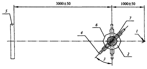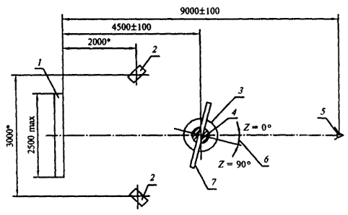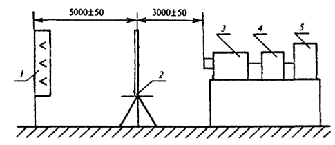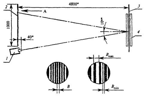 ПРИЛОЖЕНИЕ В(обязательное) Метод определения оптических искажений листового стеклаВ.1 Сущность метода Метод определения оптических искажений основан на уменьшении величины импульсов видеосигнала телекамеры, «просматривающей» экран (сетка черных линий на белом фоне) через лист стекла, при наличии в нем дефектов, приводящих к оптическим искажениям. В.2 Аппаратура Установка, состоящая из: - телевизионной установки с разрешением не менее 200 линий; - частотомера с входным сопротивлением не менее 10 МОм, минимальным значением напряжения регистрируемого сигнала не более 0,2 В и диапазоном измерений от 0 до 1 МГц; - электронного устройства, выделяющего из телевизионного сигнала импульсы, соответствующие разности между уровнями белого и черного. Сигнал на входе устройства должен иметь положительную полярность и амплитуду не менее 0,3 В; - экрана размером не менее (600´800) мм. На белом поле экрана должны быть нанесены черной матовой краской клетки, размером [(80´60)±2] мм; линии, их образующие, наклонены под углом (45±1)° к горизонту и имеют толщину (5,0±0,5) мм; освещенность экрана - от 100 до 1000 лк при неравномерности не более 50 лк по полю экрана; - держателя образцов, снабженного лимбом для отсчета углов между плоскостью образца стекла и направлением наблюдения телекамеры с ценой деления 1°; при совпадении направления наблюдения с плоскостью листа стекла угол равен 0°; - объектива с фокусным расстоянием (135±5) мм и диафрагменным числом не менее 3,5. Схема установки представлена на рисунке В.1. 1 - экран; 2 - держатель образцов; 3 - телевизионная установка; 4 - электронное устройство; 5 - частотомер Рисунок В.1 - Схема установки для определения оптических искажений стекла Изменяя диафрагменное число, регулируют установку так, чтобы для стекол марок М0, M1, M2, М3 она регистрировала наличие оптических искажений при оптической силе дефектов 0,08 дптр, а для стекол марок М4, М5, М6 - при 0,2 дптр. В.3 Отбор образцов Испытания проводят на образцах стекла шириной (200±50) мм вдоль направления вытягивания и длиной от 400 до 1600 мм. Листы стекла больших размеров разрезают на образцы указанных размеров. В.4 Проведение испытания Перед установкой образца на дисплее частотомера считывают показания (число N0). Ставят образец в держатель образцов так, чтобы направление вытягивания было вертикальным. Угол на лимбе держателя должен соответствовать 5.1.1 настоящего стандарта. Затем считывают показания частотомера (число Nx). Образец просматривают телекамерой по всей длине, последовательно перемещая каретку. В.5 Обработка результатов Образец стекла соответствует заданному показателю качества (на лимбе держателя угол - по 5.1.1), если выполняется условие