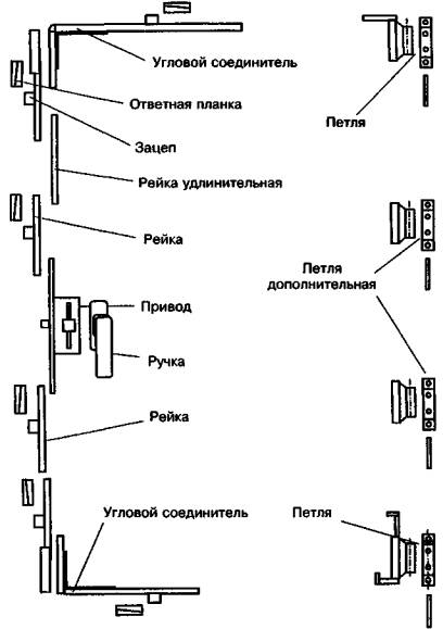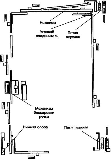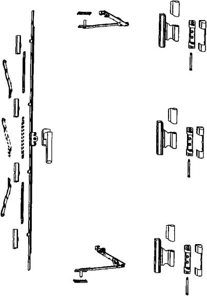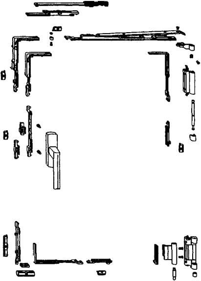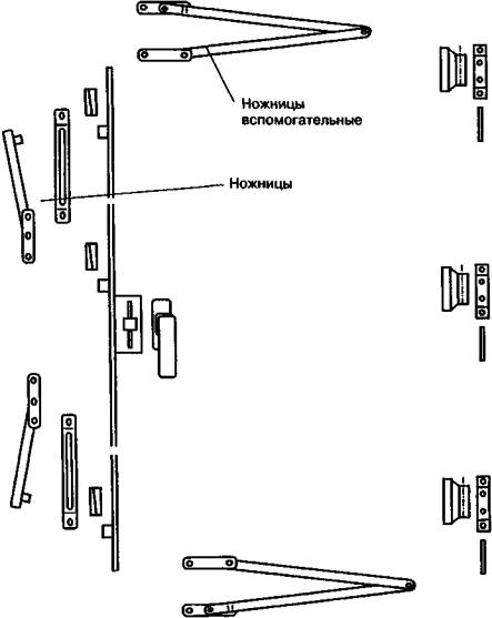 Рисунок Б.4 - Пример поворотно-откидного устройства для оконного блока из алюминиевого профиля Рисунок Б.5 - Основные детали и узлы поворотного устройства Рисунок Б.6 - Основные узлы откидного устройства (см. рисунок Б.5)