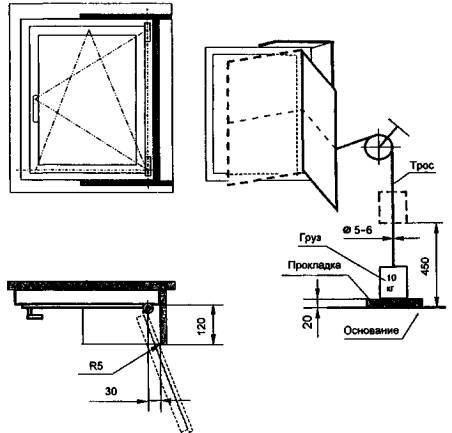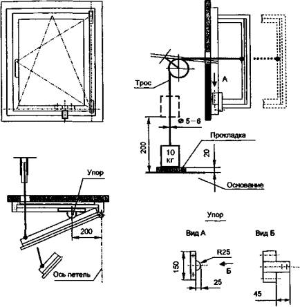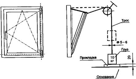 Рисунок Б.7 - Основные узлы поворотно-откидного устройства (см. рисунки Б.5, Б.6) ПРИЛОЖЕНИЕ В(рекомендуемое) Схемы приложения нагрузок Схемы приложения статических нагрузок Рисунок В.1 - Схема приложения статической нагрузки на верхнюю петлю Рисунок В.2 - Схема приложения статической нагрузки на нижнюю петлю Схемы приложения динамических нагрузок Рисунок В.3 Примечание - Падение груза прекращают на расстоянии 20 мм от основания (например, с помощью прокладки). Длину троса определяют из условия касания грузом основания при максимальном раскрытии ножниц. Рисунок В.4 Примечание - Падение груза прекращают на расстоянии 20 мм от основания (например, с помощью прокладки). Длину троса определяют из условия одновременного касания грузом основания и створкой упора. Рисунок В.5 (см. примечание к рисунку В.4) Рисунок В.6 ПРИЛОЖЕНИЕ Г(информационное) Сведения о разработчиках стандарта Настоящий стандарт разработан рабочей группой специалистов в составе: Т.В. Власова, Центр по сертификации оконной и дверной техники (руководитель); Л.В. Воронкова, Центр по сертификации оконной и дверной техники; Д.Н. Шведов, Центр по сертификации оконной и дверной техники; С.Н. Сопин, ФГУП ЦПКТБ; Н.В. Шведов, Госстрой России; X. Диль, «Siegenia-Frank KG»; В.Ф. Тренев, ЗАО «Т.Б.М.»; B.C. Савич, ФГУП ЦНС.