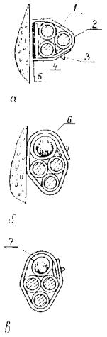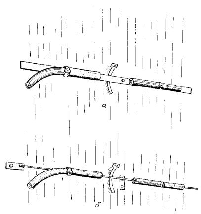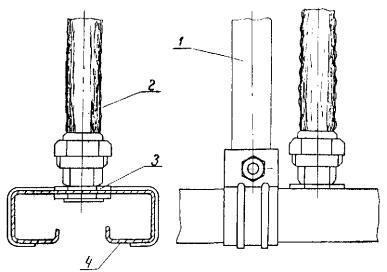 При непосредственном креплении незащищенных проводов и кабелей с металлической оболочкой к несущей полосе, струне, тросу эластичные изоляционные прокладки должны устанавливаться в местах креплений между проводниками и полосой, струной или тросом (рис. 1).