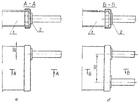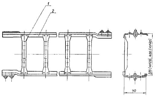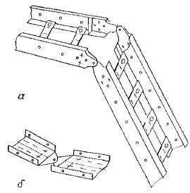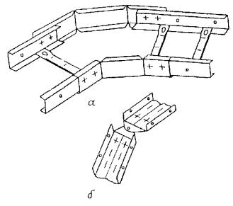 4.9. Соединения секций лотков в одной плоскости должны выполняться: прямых однотипных НЛ5 или НЛ10 - с помощью соединителей в виде швеллеров (рис. 4, а), НЛ20 или НЛ40 - путем ввода одной секции в другую на 135 мм и скрепления стандартными крепежными изделиями (рис. 4, б).