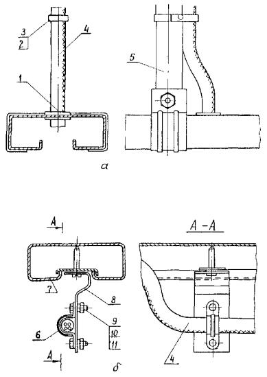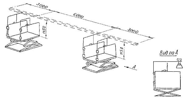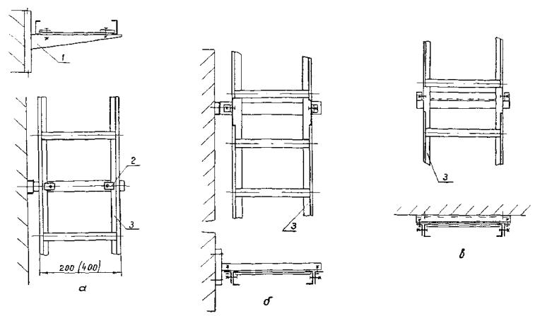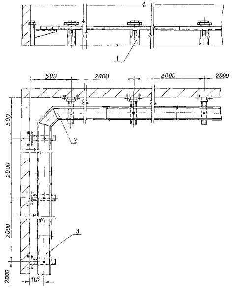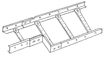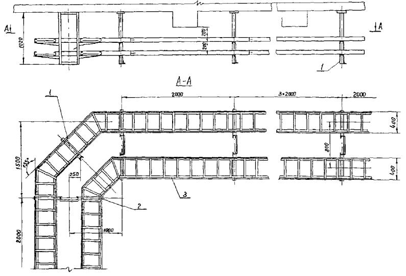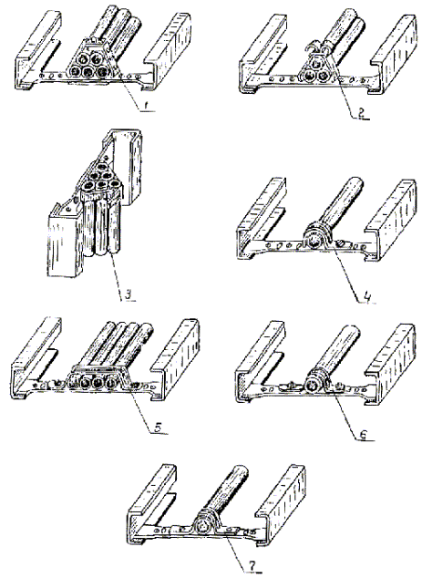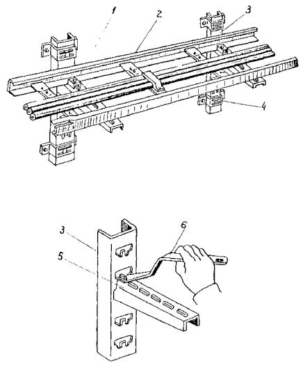 4.3. Лотки устанавливаются как в вертикальной, так и горизонтальной плоскостях вплотную к стенам и на сборных кабельных конструкциях (стойках, полках, подвесках), в состав которых входят готовые для сборки элементы, обеспечивающие создание трассы с необходимыми поворотами и разветвлениями (рис. 4 - 10), а также на полках и конструкциях, изготовляемых в МЭЗ по чертежам (рис. 11 - 18).