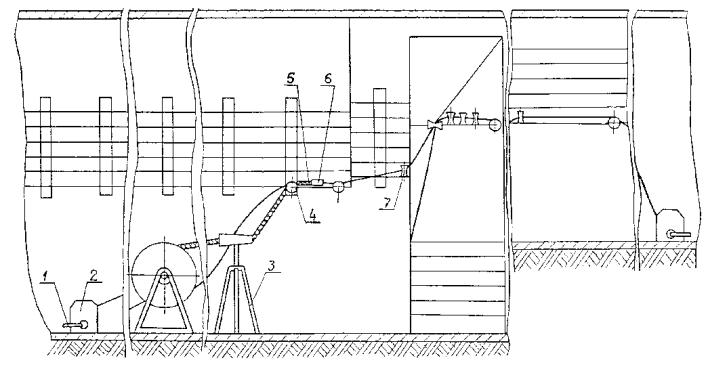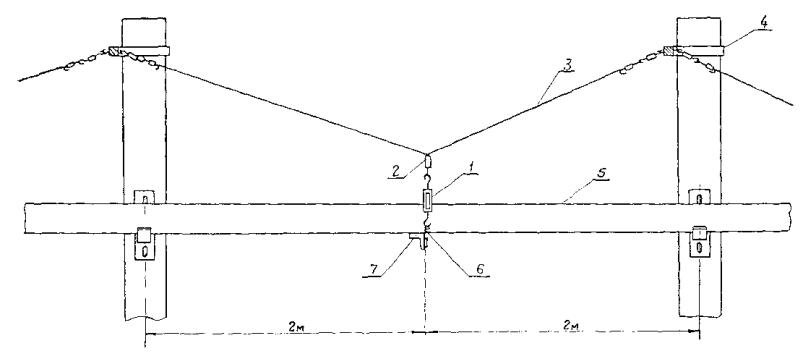 1 - лента; 2 - провод; 3 - кнопка; 4 - прокладка изоляционная; 5 - полоса; 6 - струна или трос; 7 - труба (отрезок) изоляционная