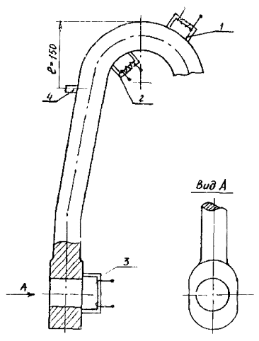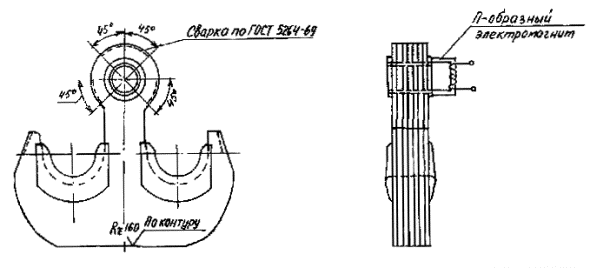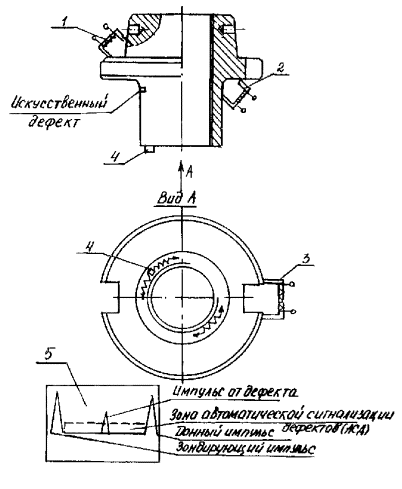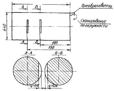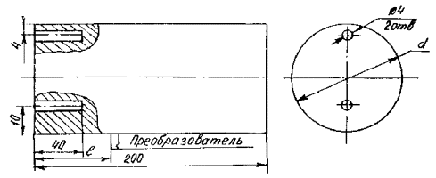 Рис. 1. Крюк (а) и крюкоблок (б): 1 - центральный рог; 2 - боковой рог; 3 - ось крюка; 4 - ствол; 5 - палец; 6 - корпус; 7 - стакан; 8 - гайка; 9 - ось блоков (шкивов); 10 - щека (правая, левая); 11 - шкив (блоки) 1.4. Периодичность контроля крюкоблоков и крюков обусловлена длительностью и структурой ремонтных циклов бурового оборудования.* *Министерство нефтяной промышленности. Система технического обслуживания и планового ремонта бурового и нефтепромыслового оборудования в нефтяной промышленности. - 2-е изд., перераб. и доп. - М.: ВНИИОЭНГ, 1982. - 128 с. 2. АППАРАТУРА2.2. Для проведения НК магнитным (магнитопорошковым) методом применяют дефектоскопы ПМД-70, МД-50П, МД-600 или аналогичные им. 2.3. Для проведения НК акустическим (ультразвуковым) методом применяют дефектоскопы ультразвуковые типа ДУК-66, ДУК-66ПМ, УД-10П, УД-10УА или аналогичные им, а также дефектоскопы УДМ-1М, УДМ-3. 2.4. Для контроля резьб феррозондовым методом применяют дефектоскоп МД-42К или аналогичное ему устройство. 2.5. Эксплуатация аппаратуры производится в соответствии с техническим описанием и инструкцией по эксплуатации. 2.6. Для НК оси и пальца штропа, резьбы ствола, гайки крюка и крюкоблока ультразвуковым методом применяют прямой или раздельно-совмещенный преобразователь с рабочей частотой 2,5 МГц. 2.7. Для НК в зоне отверстий в деталях крюка и крюкоблока применяют наклонный преобразователь с углом призмы 30, 40 и 50° и рабочей частотой 1,8-2,5 МГц. 2.8. Стандартный образец для настройки аппаратуры при контроле резьбы ствола (рис. 2) аналогичен стандартному образцу для контроля элеваторов (РД 39-12-960-83 «Методика неразрушающего контроля элеваторов и штропов»). Он представляет собой цилиндр диаметром 40 мм и длиной 200 мм, изготовленный из стали 40ХН, на котором имеются два контрольных дефекта - риски прямоугольного профиля глубиной 4 мм, смещенные по окружности на 180° и расположенные на расстояниях 100 и 150 мм от торца. Рис. 2. Стандартный образец для контроля резьбы ствола Рис. 3. Боек для изготовления искусственных дефектов типа зарубок Рис. 4. Стандартный образец для контроля штропа (d - диаметр контролируемого штропа) Рис. 5. Стандартный образец для контроля гайки крюка: 1, 2, 3 - П-образный электромагнит; 4 - ультразвуковой преобразователь; 5 - изображения на экране дефектоскопа Контрольные дефекты наносятся дисковой фрезой толщиной 1 - 1,5 мм и диаметром 60 мм. Для настройки чувствительности при контроле отверстия на стволе на части вилки списанного ствола наносят зарубку площадью 15 мм2 (3 мм ´ 5 мм). Зарубку наносят с помощью специального бойка, который показан на рис. 3. 2.9. Стандартный образец для контроля штропа (рис. 4) длиной 200 мм изготавливается из материала штропа или вырезается из струны списанного штропа. Образец имеет два контрольных дефекта (плоскодонные сверления) диаметром 4 мм и глубиной 40 мм, нанесенные с торцовой поверхности образца, как показано на рис. 4. Контрольные дефекты наносят цилиндрической фрезой диаметром 4 мм или сверлом диаметром 3,8 мм, а затем разверткой диаметром 4 мм. 2.10. Стандартный образец для настройки аппаратуры при контроле гайки ствола (рис. 5) изготавливается из бездефектной гайки списанного крюка контролируемого типоразмера. На образец наносят искусственный дефект в виде пропила (глубина 4 мм) в зоне перехода цилиндрической части к опорной поверхности. Пропил наносят дисковой фрезой диаметром 60 мм,