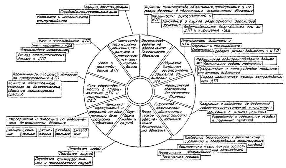 Управления Начальник Юридического Секретарь ЦK профсоюза Вводится впервые Приказом Министерства нефтяной промышленности Настоящий руководящий документ включает в себя положения, методические указания, рекомендации, которые определяют и регламентируют порядок организации работ по обеспечению безопасности дорожного движения в системе Министерства нефтяной промышленности. Схема основных элементов обеспечения безопасности движения представлена на странице четыре. 1. ОРГАНИЗАЦИЯ РАБОТЫ ПО ОБЕСПЕЧЕНИЮ БЕЗОПАСНОСТИ ДОРОЖНОГО ДВИЖЕНИЯФункции Министерства и его управлений 1.1. Министерство нефтяной промышленности 1.1.1. Осуществляет техническую политику, направленную на улучшение и оздоровление условий труда на производстве, на совершенствование организации работы по обеспечению безопасности движения транспортных средств отрасли. Предусматривает для этих целей необходимые материально-технические и финансовые ресурсы. 1.1.2. Организует научные исследования по вопросам обеспечения безопасности движения, а также внедрение в производство достижений науки и техники в области безопасности движения. 1.1.3. Утверждает разработанные в установленном порядке отраслевые нормативные документы, правила, типовые инструкции, программы обучения и проверки знаний водителей, ремонтных рабочих и инженерно-технических работников по вопросам обеспечения безопасности движения. 1.1.4. Организует и осуществляет внутриведомственный контроль за соблюдением законодательства о труде, правил и норм по безопасности движения, за выполнением приказов и указаний и принимает меры по устранению выявленных недостатков. 1.1.5. Организует и осуществляет через соответствующие научно-исследовательские институты распространение передового опыта работы в области безопасности движения. 1.2. Транспортное управление 1.2.1. Осуществляет методическое руководство по разработке планов развития, содержания и ремонта транспортных средств с учетом требований безопасности движения и организовывает выполнение этих планов. 1.2.2. Организует и осуществляет контроль за безопасной эксплуатацией транспортных средств отрасли. 1.2.3. Осуществляет методическое руководство службами безопасности дорожного движения главных управлений, управлений, объединений, предприятий и организаций Министерства. 1.2.4. Осуществляет контроль за своевременным оснащением объектов механизмами, приборами и приспособлениями, повышающими безопасность движения и техническую надежность транспортных средств отрасли. 1.2.5. Осуществляет контроль за правильным и своевременным расследованием и учетом дорожно-транспортных происшествий, в необходимых случаях участвует в расследовании дорожно-транспортных происшествий, повлекших за собой тяжелые несчастные случаи. 1.2.6. Организует совместно с Управлением кадров и учебных заведений повышение квалификации работников Управления и служб безопасности дорожного движения главных управлений, управлений, объединений, предприятий и организаций Министерства. 1.2.7. Осуществляет совместно с Управлением охраны труда контроль за организацией проведения инструктажей и обучения водителей, ремонтных рабочих и инженерно-технических работников, проверкой их знаний и качеством повышения их квалификации. 1.2.8. Подготавливает с участием соответствующих подр