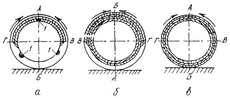 7.6. При сварке горизонтальных стыков трубопроводов из углеродистых и низколегированных сталей высота валика должна быть 3...5 мм, ширина (наибольший размер в поперечном сечении) не более 10 мм. 7.7. Стыки труб из низколегированных сталей при толщине стенки более 12 мм необходимо сваривать неповоротными во избежание появления трещин в первых слоях шва при повороте труб. 7.8. Неповоротные (вертикальные и горизонтальные) стыки труб диаметром 219 мм и более с целью поддержания необходимого температурного режима в процессе сварки и уменьшения деформации должны сваривать в зависимости от диаметра труб два, три или четыре сварщика, работающие одновременно. Примечание. Стыки труб из углеродистой стали при толщине стенки до 25 мм может сваривать один сварщик (независимо от диаметра труб). Наложение слоев при сварке труб диаметром до 219 мм производят в порядке, указанном на рис. 7, а. Первые три слоя стыков труб диаметром более 219 мм (для равномерного распределения напряжений по стыку и уменьшения деформации) следует выполнять обратноступенчатым способом (рис. 7, б), при этом длина каждого участка шва не должна превышать 200...250 мм. Длина участков последующих слоев может составлять половину окружности стыка. 7.10. Горизонтальные (неповоротные) стыки труб сваривает один сварщик в соответствии с рис. 8, а (трубы диаметром до 219 мм) и рис. 8, б (обратноступенчатый способ, трубы диаметром более 219 мм). Стыки труб диаметром 219...300 мм сваривают участками длиной, равной одной четвертой окружности стыка, большего диаметра - участками длиной 200...250 мм. 7.11. Поворотные стыки следует сваривать следующим образом. Стыки труб с толщиной стенки до 12 мм можно сваривать, поворачивая трубу на 360° (круговое вращение), 180 и 90°. Поворотные стыки сваривает, как правило, один сварщик. Рис. 7. Порядок наложения слоев при сварке вертикального неповоротного стыка труб диаметрами до 219 мм (а) и более 219 мм (б): 1-14 последовательность наложения слоев I-IV - слои шва Рис. 8. Порядок наложения слоев (валиков) при сварке горизонтального стыка труб одним сварщиком Если сварку стыка с поворотом на 360° выполняют на рольгангах с механическим вращением труб (со скоростью, равной скорости сварки), то удобнее накладывать шов не в зените, а на участке, смещенном от вертикали на 30...35° в сторону, обратную направлению вращения труб (рис. 9, а). При отсутствии механического вращения трубы поворачивают несколько раз, причем единовременный угол поворота a в зависимости от диаметра труб должен составлять 60...110° с тем, чтобы наложение шва происходило в нижнем и вертикальном положении (рис. 9, б, в). Сварку труб диаметром более 219 мм выполняют обратноступенчатым способом за два полных поворота. Сначала на участке АБ (см. рис. 9, б) накладывают один-два слоя, а затем заполняют последовательно оставшуюся часть разделки за второй поворот трубы. Рис. 9. Порядок выполнения сварки стыка труб с поворотом на 360°: I - направление вращения труб; II - направление сварки 7.12. Сварку стыков с поворотом на 180° производят в два приема. Сначала на участках ГА и ВА (рис. 10, а) накладывают один-два слоя, затем трубу поворачивают на 180° и заваривают участки ВБ и ГБ полностью [заполняют все сечение шва (рис. 10, б)]. После этого трубы опять поворачивают на 180° и накладывают остальные слои на участках ГА и ВА (рис. 10, в). 7.13. Сварку стыков с поворотом на 90° производят 