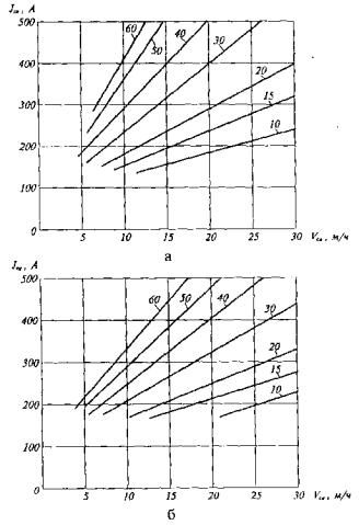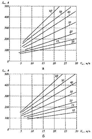 а - при однодуговой сварке; б - при двухдуговой сварке Черт. 6 2.1.13. Автоматическую сварку швов тавровых соединений в угол следует выполнять проволокой диаметрами от 2 до 3 мм. Расположение электрода при однодуговой автоматической сварке в угол должно соответствовать указаниям черт.6, а, а при двухдуговой - черт.6, б. Режимы автоматической сварки под флюсом в угол с полным проваром стенки приведены в табл.8 и 9 рекомендуемого приложения 5. 2.2. Полуавтоматическая сварка в защитном газе и самозащитной порошковой проволокой2.2.1. Режимы полуавтоматической сварки в защитном газе самозащитной порошковой проволокой следует назначать в зависимости от толщины свариваемого металла, диаметра сварочной проволоки и положения шва в пространстве. Режимы сварки проволокой сплошного сечения диаметром от 1,2 до 2,0 мм и порошковой проволокой диаметром 2,2 мм приведены в табл. 10-13 рекомендуемого приложения 5. Режимы сварки самозащитной порошковой проволокой приведены в табл. 14-16 рекомендуемого приложения 5. 2.2.2. Расход защитного газа следует назначать в зависимости от диаметра сварочной проволоки и величины сварочного тока в соответствии с табл. 4. При сварке на сквозняке расход защитного газа необходимо увеличить в 1,5 раза. 2.2.3. При сварке в защитном газе перед возбуждением сварочной дуги следует обдуть место сварки защитным газом для вытеснения воздуха из зоны сварки с целью предупреждения образования пор в начале шва. Таблица 4 Расход защитного газа