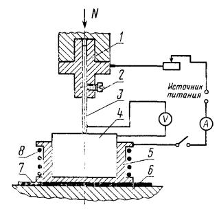 2.10.6. Соединения считают выдержавшими испытание, если за время испытаний не отмечено ни одного отказа. 2.10.7. Методика испытания контакт-деталей для прогнозирования наработки на отказ соединения приведена в приложении 1. (Измененная редакция, изм. №1). 2.10.8. Методика испытаний контактных соединений для прогнозирования среднего срока службы приведена в приложении 2. (Добавлено, изм. №1). ПРИЛОЖЕНИЕ 1Рекомендуемое МЕТОДИКА ИСПЫТАНИЯ КОНТАКТ-ДЕТАЛЕЙ ДЛЯ ПРОГНОЗИРОВАНИЯ НАРАБОТКИ НА ОТКАЗ СОЕДИНЕНИЯ1. Аппаратура и материалы 1.1. Измерения производят на установке, смонтированной на базе прибора ПМТ-3 или ПМТ-5, в котором алмазная пирамидка заменена золотым электродом в виде иглы (чертеж). Допускается применение позолоченной иглы с толщиной покрытия не менее 3 мкм, например, золоченых контактов разъемов типа 2PMAI. В держателе 1 крепят винтом 2 золотую иглу 3 с радиусом закругления вершины 0,5 мм. Образец 4 устанавливают в оправке 5, закрепленной на столике 6 прибора ПМТ и изолированной от него прокладкой 7. Оправка снабжена нагревателем 8. Температуру образца измеряют термопарой с помощью прибора, имеющего класс точности не менее 1,5. Нормальную нагрузку задают гирями и прикладывают посредством нагружающего устройства прибора ПМТ. Допускается применение другого нагружающего устройства, обеспечивающего строго вертикальное перемещение иглы 3 и погрешность в величине приложенной нормальной нагрузки не более 0,005 Н. Установка должна быть виброизолирована.