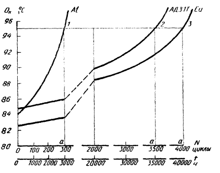 где А - поминальная (кажущаяся) площадь соединения, м2; N - нормальная нагрузка в соединении, Н; НВ - твердость материала контакт-деталей, Па. ПРИЛОЖЕНИЕ 2Рекомендуемое МЕТОДИКА ИСПЫТАНИЙ КОНТАКТНЫХ СОЕДИНЕНИЙ ДЛЯ ПРОГНОЗИРОВАНИЯ СРЕДНЕГО СРОКА СЛУЖБЫ1. Испытания проводят на выборке контактных соединений каждого типа в режиме циклического нагревания в соответствии с п. 2.8. 2. Через каждые 100 циклов устанавливают перерывы, в процессе которых осуществляют дополнительный нагрев контактных соединений номинальным током до установившейся температуры в соответствии с п. 2.7, которую измеряют и регистрируют. 3. Испытания продолжают до достижения контактными соединениями допустимой температуры по ГОСТ 10434-82. По полученным экспериментальным данным после окончания ускоренных испытаний строят зависимости среднего значения температуры от числа циклов. Затем осуществляют переход от результатов ускоренных испытаний к ожидаемым результатам в условиях эксплуатации. Для этого масштабируют число циклов во времени (рекомендуемый масштаб: 1 цикл эквивалентен 10-15 ч нагрева контактных соединений номинальным током). 4. По зависимости температуры от времени, полученной для данного типа контактного соединения, определяют средний срок его службы, т.е. находят точку «а» по допустимой температуре нагрева, как показано на чертеже.