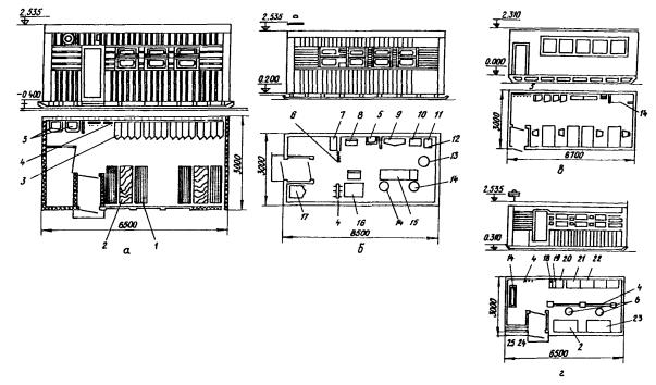 а - гардеробной с сушилкой (проект 31315); б - медпункта (проект 31315); в - конторы (проект С-1660); г - инструментальной кладовой (проект 31315); 1 - скамья-шкаф для инструмента; 2 - рабочий стол; 3 - шкаф для одежды; 4 - вешалка для одежды; 5 - раковина; 6 - занавес; 7 - санитарные носилки; 8 - полумягкий стул, 9 - шкаф для медикаментов; 10 - инструментальный столик; 11 - сухожаровой стерилизатор; 12 - перевязочный стоя; 13 - подставка для тазов Х-ООО-ОM; 14 - винтовой табурет; 15 - смотровая кушетка; 16 - стол врача; 17 - универсальный шкаф: 18 - подвески для чертежей; 19 - пирамида; 20 - бытовая лестница; 21 - стеллаж для абразивов; 22 - стеллаж с поддонами; 23 - верстак; 24 - поддон; 25 - скоба для длинномерного инструмента