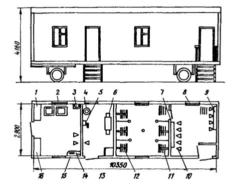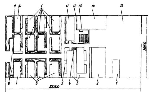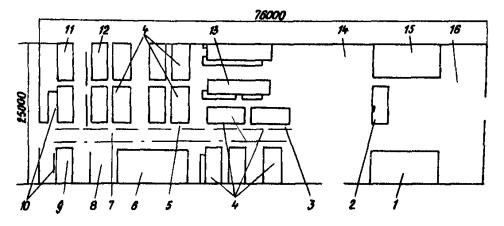 1 - мастерская; 2 - инструментальная; 3 - склад; 4 - устройство для мытья обуви; 5 - гардеробная с сушилкой; 6 - противопожарный щит; 7 - красный уголок; 8 - киоск газированной воды; 9 - площадка для отдыха; 10 - доска показателей; 11 - диспетчерская; 12 - контора; 13 - кабинет по технике безопасности; 14 - душевая; 15 - площадка для стоянки личного автотранспорта; 16 - площадка для хранения материалов и изделий