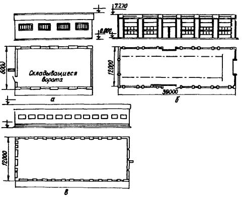 а - первый вариант планировки (проекты 420-09-15 и 420-09-16); б - то же, второй вариант (проект 31271); в - третий вариант (проекты С-1601 и С-1579)