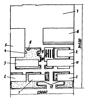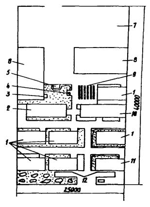 1 - контора; 2 - гардеробная с сушилкой; 3 - красный уголок; 4 - противопожарный щит; 5 - мастерская; 6 - устройство для мытья обуви; 7 - площадка для хранения материалов, изделий и стоянки автотранспорта; 8 - склад; 9 - питьевой фонтанчик; 10 - площадка для отдыха; 11 - душевая; 12 - доска показателей
