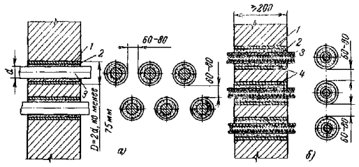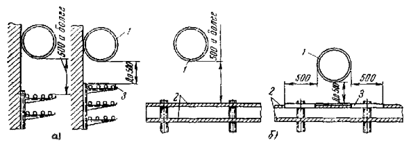 3-34. В помещениях влажных, сырых, особо сырых, жарких, пыльных и с химически активными средами концы труб, не введенные в коробки, аппараты и т.п., необходимо уплотнять вокруг проводов на длине 50 мм уплотнительным составом УС-65 или ему равноценным. 3-35. Заделка проходов труб сквозь стены и перекрытия может быть выполнена в соответствии с техническим циркуляром Главэлектромонтажа Минмонтажспецстроя СССР № 9-2-63/68 от 25 октября 1968 г. следующими негорючими легкопробиваемыми растворами: а) цементом марки 300-500 (ГОСТ 10178-62) с песком (ГОСТ 8736-67) 1:10; б) глиной с цементом марки 300-500 (ГОСТ 10178-62) и песком (ГОСТ 8736-67) 1,5:1:11; в) глиной с песком 1:3; г) перлитом вспученным (ГОСТ 10832-64) со строительным гипсом (ГОСТ 125-70) 1:2. ОТКРЫТАЯ БЕСТРУБНАЯ ПРОКЛАДКА ПРОВОДОВ И КАБЕЛЕЙ3-36. Провода в пожароопасных установках допускается прокладывать в коробах, на изоляторах и лотках (приложение 1). 3-37. В пожароопасных помещениях над местами нахождения сгораемых веществ и предметов расстояние между изоляторами вдоль линии должно быть меньше высоты расположения проводки над сгораемыми веществами и предметами. В пожароопасных помещениях допускается прокладка проводов АПР на изоляторах только в местах, удаленных от горючих материалов, и где невозможны механические повреждения проводов. 3-38. При пересечении друг с другом незащищенных изолированных проводов, проложенных на изолированных опорах с расстоянием, меньшим предусмотренного СНиП (см. табл. 6-4 III-И.6-67) для наибольшего сечения пересекающихся проводов, на один из них должен быть надет и закреплен отрезок неразрезной изоляционной трубки. При пересечении защищенных изолированных проводов с незащищенными указанные меры защиты следует принимать, если расстояние между проводами составит менее 10 мм. 3-39. Прокладку кабелей в установках всех классов рекомендуется выполнять по строительным основаниям и элементам, колоннам, фермам, на конструкциях, в коробах и лотках, на тросах, эстакадах (приложение 1). При проходе кабелей через температурные и осадочные швы следует предусматривать компенсацию для кабелей за счет их свободного провеса без крепления по обе стороны шва. 3-40. Транзитная прокладка проводов и кабелей через пожароопасные помещения всех классов не рекомендуется. При необходимости прокладку проводов и кабелей следует выполнять только в металлических трубах. Транзитная прокладка через складские помещения запрещается. 3-41. При открытой прокладке кабеля должна предусматриваться его защита: в наружных установках - от действия солнечной радиации, в помещениях - от излучения различных источников тепла. 3-42. В пожароопасных установках всех классов установка на кабелях соединительных муфт запрещается. 3-43. При совместной прокладке кабелей с технологическими трубопроводами, несущими горючие продукты, в помещениях класса П-I следует руководствоваться требованиями п. 3-24 настоящей инструкции. 3-44. При прокладке бронированных и небронированных кабелей на эстакадах в наружных установках класса П-III (рис. 2) следует руководствоваться требованиями пп. 3-25 и 3-26 настоящей инструкции. 3-45. Допускается обход кабелями различных трубопроводов в любом направлении в зависимости от местных условий. При этом кабели, проложенные в непосредственной близости от технологических трубопроводов, а также места возможного механического поврежде