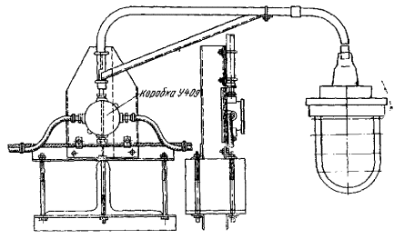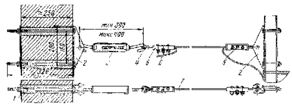 Рис. 6. Подвод питания к светильникам при тросовой прокладке кабелей ниже нижнего пояса фермы. Рис. 7. Подвод питания к светильникам при прокладке кабелей по нижнему поясу фермы. 3-78. Жилы кабелей необходимо соединять только в пыленепроницаемых коробках, например У409, выпускаемых по ТУ 16-536.249-71. 3-79. Места соединений жил кабелей должны быть изолированы тремя-четырьмя слоями липкой поливинилхлоридной ленты. 3-80. Запрещается применять полиэтиленовые колпачки для изоляции жил в местах их соединений и ответвлений. 3-81. Вводимые в ответвительную коробку кабели должны быть уплотнены ввертыванием сальниковой гайки до отказа. Надежность уплотнения проверяют легким подергиванием кабеля. В случае повреждения перепонки в неиспользованных рожках коробки У409 следует закрыть отверстия в них металлическими или пластмассовыми заглушками толщиной 1,2 мм, подложив их под резиновые уплотнительные кольца. 3-82. На рис. 5-7 показаны варианты подвода питания к светильникам; точки крепления подвесов светильника и вертикальной подвески троса совпадают. 4. ОКОНЦЕВАНИЕ, СОЕДИНЕНИЕ ЖИЛ ПРОВОДОВ И КАБЕЛЕЙ И ПРИСОЕДИНЕНИЕ К ТОКОПРИЕМНИКАМ4-1. Область применения способов оконцевания, соединения и ответвления жил проводов и кабелей приведена в табл. 1 и 2 «Инструкции по оконцеванию и соединению алюминиевых и медных жил изолированных проводов и кабелей» МСН 139-67/ММСС СССР, которой следует руководствоваться при оконцевании, соединении и ответвлении жил проводов и кабелей. 4-2. Для оконцевания проводов и кабелей следует применять: а) при опрессовке алюминиевых жил - трубчатые алюминиевые наконечники ТА и трубчатые медно-алюминиевые ТАМ (ГОСТ 9581-68), медных жил - медные трубчатые наконечники Т (ГОСТ 7386-70); б) при электросварке, газовой сварке и пайке алюминиевых жил - алюминиевые литые наконечники ЛА (ГОСТ 7387-55); в) при пайке медных жил - медные штампованные наконечники П. 4-3. Непосредственное присоединение проводов и кабелей с алюминиевыми жилами и наконечников из алюминия к зажимам машин, аппаратов и т.п. может выполняться только при наличии у них зажимов, специально для этого предназначенных. При отсутствии специальных зажимов провода и кабели должны быть присоединены: однопроволочные сечением до 10 мм2 включительно - изгибанием жилы в кольцо с помощью ограничивающей шайбы-звездочки и пружинной шайбы по ГОСТ 6402-70 с предварительными зачисткой жилы, полудкой и покрытием ее кварцевазелиновой пастой; однопроволочные сечением более 10 мм2 и многопроволочные - медноалюминиевыми наконечниками, закрепляемыми опрессовкой. 4-4. Изолирование мест соединения и оконцевания проводников следует производить липкой лентой ПВХ. Допускается применять лакоткань с последующим наложением на нее прорезиненной ленты и покрытием изоляционным лаком или эмалью. 4-5. В пожароопасных установках всех классов запрещается применять: холодную скрутку жил проводов и кабелей без горячей пайки; легкоплавкие припои (сплавы висмут-олово-свинец-кадмий); сжимы в пластмассовых корпусах всех типов (У730м-У872) для выполнения ответвлений от магистральных алюминиевых и медных проводов. 5. МОНТАЖ ЭЛЕКТРОДВИГАТЕЛЕЙ5-1. Стационарно установленные электродвигатели как с искрящими, так и с неискрящими частями, по условиям работы в соответствии с ПУЭ должны иметь следующие исполнения: а) в помещениях класса П-I - бр