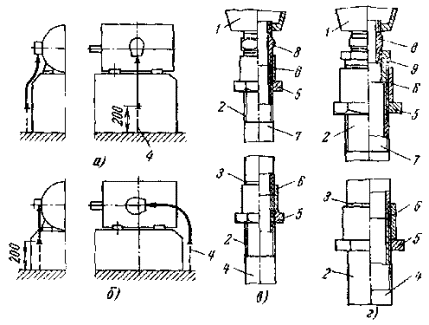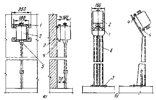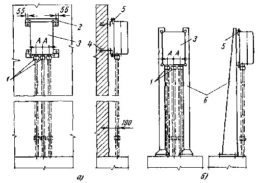 Примечание. Коробка выводов у двигателей 1-5 габаритов может быть повернута на угол, кратный 45°, а у двигателей 6-9 габаритов - на угол, кратный 90°. 5-7. Вариант подвода проводов и кабелей к вводной коробке электродвигателей серии АО2 в резинотканевом рукаве приведен на рис. 10. Рис. 10. Исполнение подводов проводов и кабелей к электродвигателям АО2 в резинотканевых рукавах. а - присоединение к трубопроводу заземляющего проводника с помощью хомута; б - подводящая труба 25 мм; в - подводящая труба 40 мм; 1 - коробка выводов двигателя; 2 - муфта; 3 - рукав резинотканевый; 4 - длинная резьба; 5 - подводящая труба; 6 - контргайка; 7 - патрубок; 8 - футорка; 9 - трубопровод. 6. МОНТАЖ ПУСКОВОЙ АППАРАТУРЫ6-1. Стационарно устанавливаемая в пожароопасных установках пусковая аппаратура, искрящая по условиям работы, должна иметь в соответствии с ПУЭ следующие исполнения: а) в помещениях класса П-I - пыленепроницаемое или маслонаполненное; б) в помещениях класса П-II - пыленепроницаемое; в) в складских помещениях класса П-IIа - пыленепроницаемое или маслонаполненное; г) в производственных помещениях класса П-IIа - закрытое; д) в наружных установках класса П-III - закрытое. 6-2. Пусковая аппаратура, не искрящая по условиям работы, стационарно устанавливаемая в пожароопасных установках всех классов, должна иметь закрытое исполнение. 6-3. В пожароопасных установках всех классов допускается применение пусковых аппаратов в открытом и защищенном исполнениях при установке их в шкафах закрытого (уплотненного) исполнения. 6-4. Запрещается применять пусковые аппараты в маслонаполненном исполнении в помещениях с кислородными установками. 6-5. Для отключения всех электроприемников, расположенных в запираемых складских помещениях, содержащих горючие материалы или материалы в сгораемой упаковке, вне склада следует устанавливать общий аппарат управления независимо от наличия таких аппаратов внутри склада. Аппарат управления должен устанавливаться на несгораемой стене в специальном несгораемом ящике с приспособлением для пломбирования. При отсутствии несгораемых стен аппарат управления необходимо устанавливать на отдельной опоре. 6-6. В пожароопасных установках всех классов в качестве пусковой аппаратуры рекомендуется применять магнитные пускатели (пыленепроницаемые ПМП, пылебрызгонепроницаемые ПМЕ, пылезащищенные и пылебрызгонепроницаемые ПА), а также кнопки водозащищенного исполнения КУ-123. Рис. 11. Варианты установки пускателей ПА в пылеводонепроницаемом исполнении. а - на стене; б - на стойках; 1 - муфта; 2 - профиль; 3 - пускатель; 4 - дюбель; 5 - болт (гайка, шайба); 6 - стойка. Габаритные и установочные размеры отдельных типов магнитных пускателей ПМП, ПМЕ и ПА приведены в приложении 4. Варианты установки пускателей ПА и кнопок КУ-123 на стойках и на стене приведены на рис. 11, 12. 6-7. Перед монтажом пускателей следует проверить их исправность. Для этого необходимо снять крышку кожуха; протереть полюсы магнитной системы; проверить рабочий ход подвижной части якоря (якорь должен свободно возвращаться в исходное положение) наличие всех деталей контактора, надежность работы блокировочного механизма у реверсивного пускателя и блок-контактов нулевой защиты; замерить сопротивление изоляции, просушить изоляцию пускателя, если сопротивление менее 1 мОм, а также проверить затяжку всех винтов и 