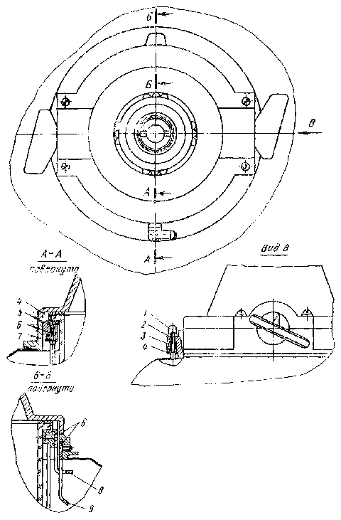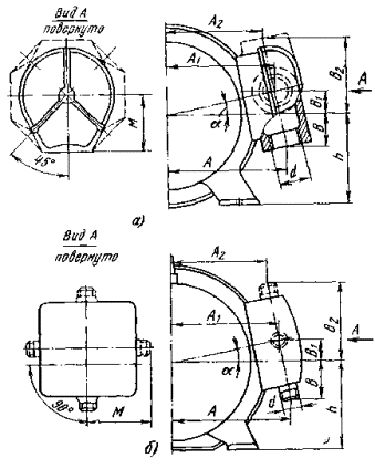 Примечания: 1. Типы рукавов для различных сред имеют обозначения: Б - для бензина, керосина, нефти и минеральных масел; В - для воды и слабых растворов неорганических кислот и щелочей концентрацией до 20 %; ВГ - для горячей воды с температурой до 100 ºС; Г - для газов, воздуха, кислорода, ацетилена, углекислоты, азота и др.; П - для пищевых веществ; спирта, вина, пива, молока, слабокислых органических и других веществ; Ш - для подачи слабощелочных и слабокислых водных растворов при штукатурных работах и песка от пескоструйных аппаратов. 2. Пример условного обозначения бензостойких рукавов для давления 1,5 кгс/см2 с внутренним диаметром 25 мм; рукав Б-1,5 Ø 25 ГОСТ 8318-57. 5-6. В помещениях всех классов и наружных установках рекомендуется выполнять ввод проводов и кабелей в вводные коробки электродвигателей в резинотканевых рукавах по ГОСТ 8318-57 (табл. 5), которые должны быть стойкими к окружающей среде. Рис. 9. Расположение коробки выводов на двигателях АО2. а - 1-5-го габаритов; б - 6-9-го габаритов.