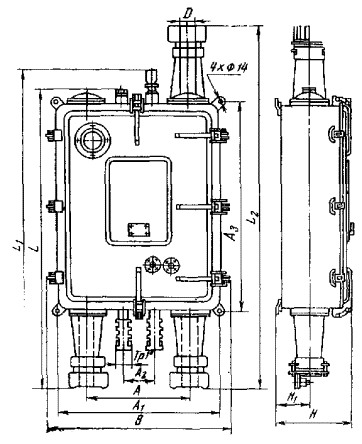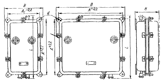 * Размеры даны без сальников. Установка привертных сальников увеличивает эти размеры на 40 мм с каждой стороны. Примечания: 1. Размеры Н1 и А2 определяют положение надрубов в оболочке (по два сверху и снизу) для ввода проводников. 2. Размеры в скобках отнесены к реверсивным пускателям без механической блокировки.