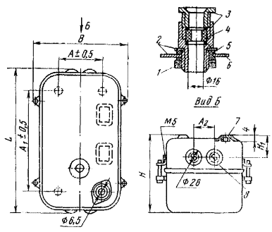 Пускатели ПМЕ-231 - ПМЕ-236. 1 - гайка; 2 - шайба; 3 - сальник в оболочке вместо пробки; 4 - уплотнение в сальнике (ставится потребителем); 5 - уплотнительное кольцо; 6 - оболочка; 7 - уплотнительная резиновая шайба в отверстиях для крепления пускателя; 8 - пробка. Таблица П4-2 Пускатели ПМЕ-231 - ПМЕ-236