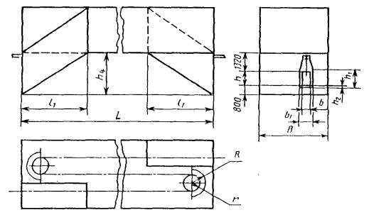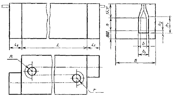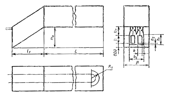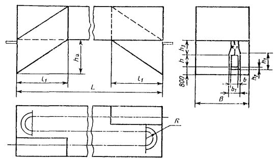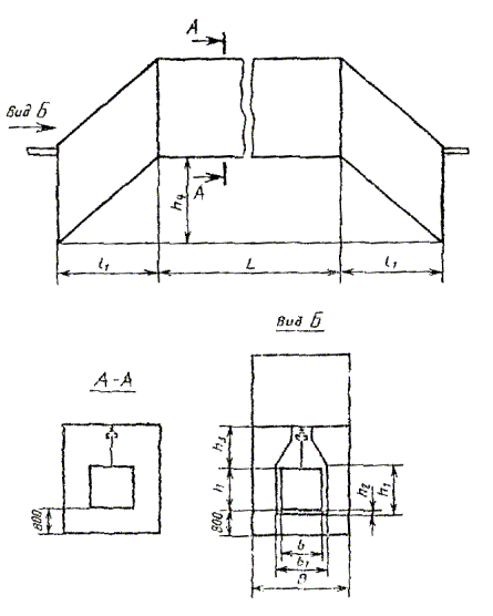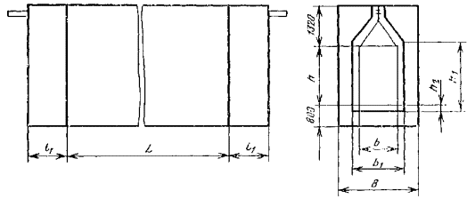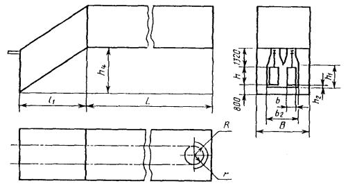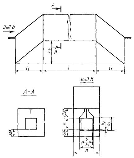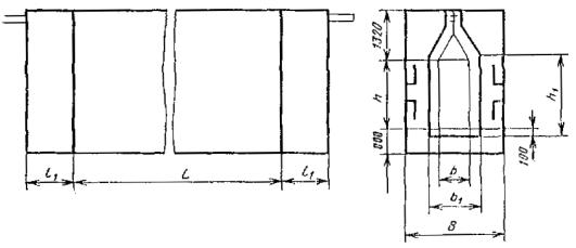 Примечание. Размеры обрабатываемого изделия указывают следующим образом: для установок проходных с подвесным толкающим непрерывно движущимся конвейером с одним ходом приводится шифр; для установок проходных с напольным непрерывно движущимся конвейером с одним ходом - ширина и высота изделия в метрах, для остальных установок - длина, длина, ширина и высота в метрах. Пример условного обозначения терморадиационно-конвективной (Т/К) сушильной установки с электрообогревом (Э) проходной (П) с подвесным толкающим (Т) непрерывно движущимся конвейером с тепловым подпором воздуха (В), одноходовой (1), в которой обрабатываются изделия шириной 0,63 м и высотой 1,6 м (05); Сушильная установка Т/К-ЭПТВ-1-05 ГОСТ 23093-78 Пример условного обозначения терморадиационной (Т) сушильной установки с электрообогревом (Э) проходной (П) с напольным (Н) непрерывно движущимся конвейером, однопроходной (1), в которой обрабатываются изделия шириной 0,4 м и высотой 1,0 м; Сушильная установка Т-ЭПН-1-0,4×1,0 ГОСТ 23093-78 Пример условного обозначения конвективной (К) сушильной установки с газовым обогревом (Г) проходной (П) с напольным циклически движущимся конвейером (НЦ), двухходовой (2), в которой обрабатываются изделия длиной 1,5 м, шириной 0,63 м и высотой 1,0 м; Сушильная установка К-ГПНЦ-2-1,5×0,63×1,0 ГОСТ 23093-78 (Измененная редакция, Изм. № 2). 1.4. Выбор типов сушильных установок приведен в рекомендуемом приложении. 2. ОСНОВНЫЕ РАЗМЕРЫ2.1. Основные размеры сушильных установок конвективных проходных с подвесным конвейером одноходовых (черт. 1) должны соответствовать табл. 3. Черт. 1 Таблица 3 мм