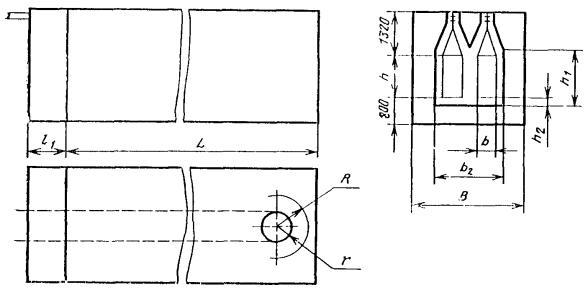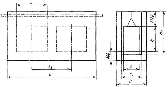 Примечания: 1. Внутренняя ширина установки В определяется числом ходов конвейера в установке и радиусом разворота изделия R с учетом необходимых зазоров; минимальное расстояние от изделия до стенки - 700 мм. 2. Двухходовые установки могут иметь два самостоятельных проема, каждый шириной b1, или один проем шириной b2. При развороте изделий в установке на одной звездочке: b2 = b1 + 1000´2r, мм. Радиус звездочки r выбирают по ГОСТ 593-75. 2.3. Размеры сушильных установок конвективных проходных с подвесным конвейером циклических (черт. 4) должны соответствовать табл. 5. Черт. 4 Таблица 5 мм